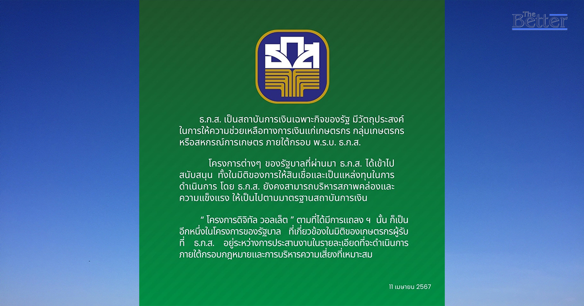 ธนาคารเพื่อการเกษตรและสหกรณ์การเกษตร (ธ.ก.ส.) ออกประกาศ เกี่ยวกับโครงการดิจิทัลวอลเล็ต ว่า เป็นการแจกเกษตรกรตามกฎหมาย ซึ่งอยู่ระหว่างการหารือรายละเอียดภายใต้กฎหมายและการบริหารความเสี่ยงที่เหมาะสม