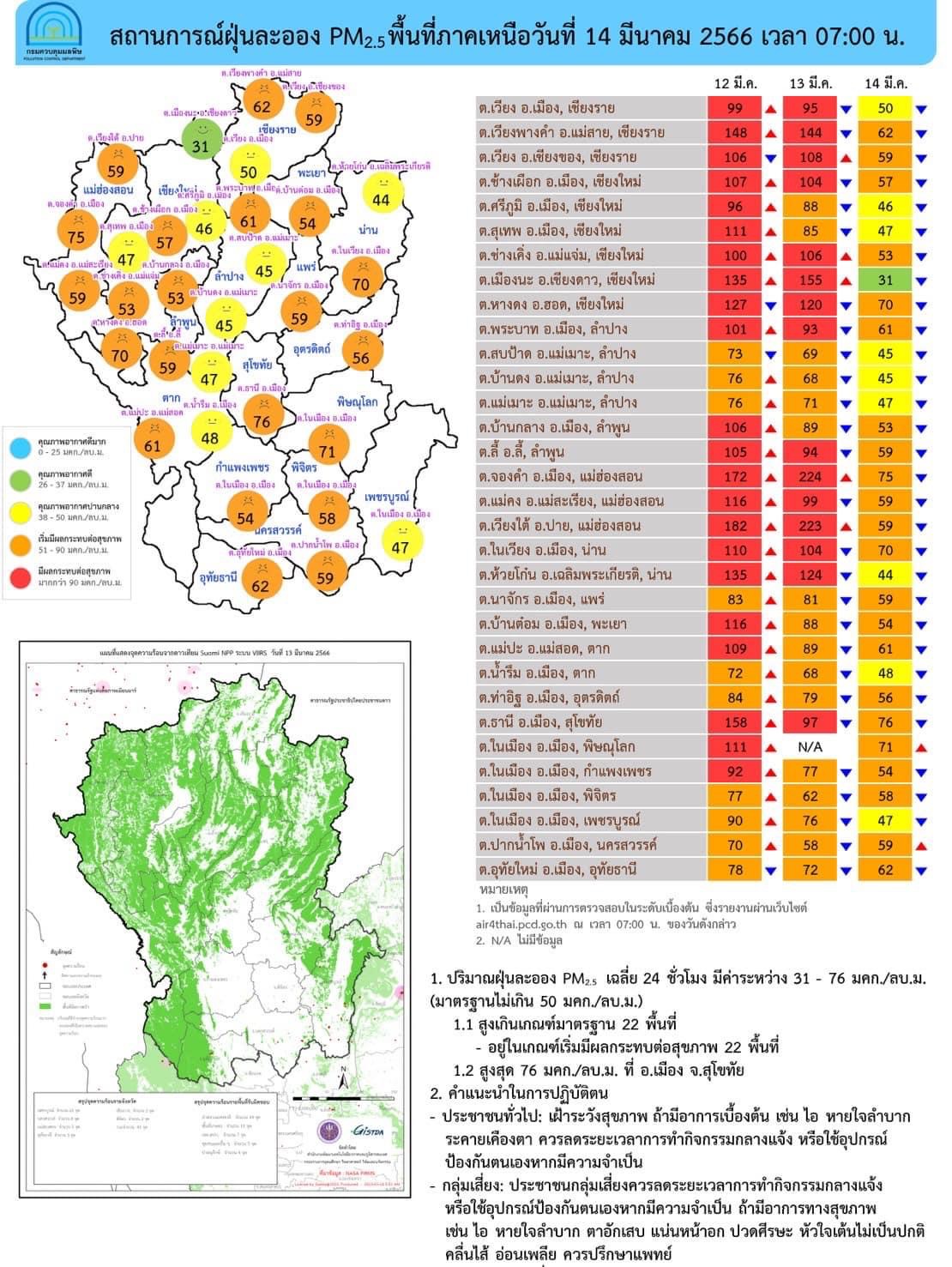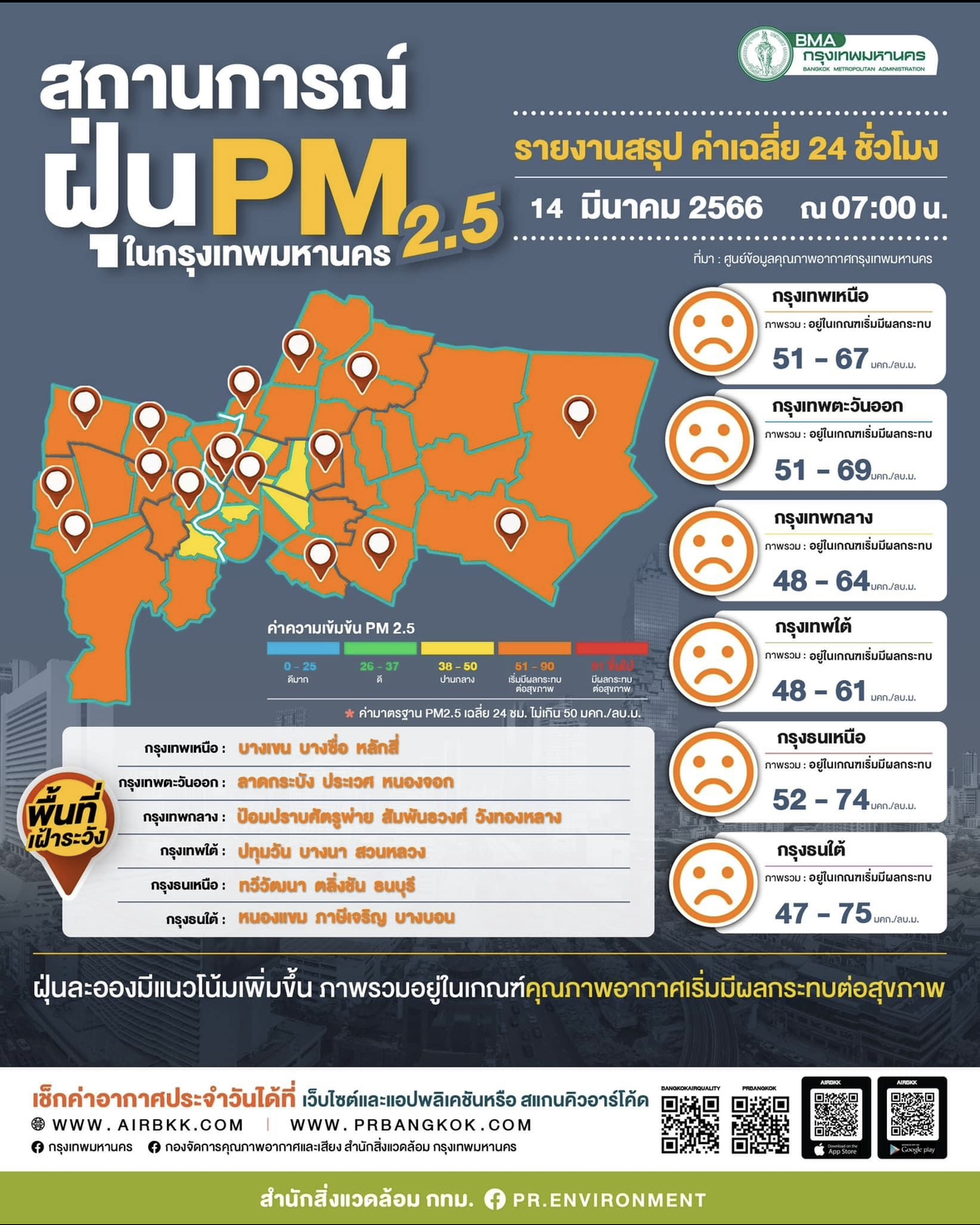ศูนย์แก้ไขปัญหามลพิษทางอากาศ รายงานการติดตามตรวจสอบคุณภาพอากาศ ประจำวันที่ 14 มีนาคม 2566 ณ 07:00 น สรุปดังนี้
