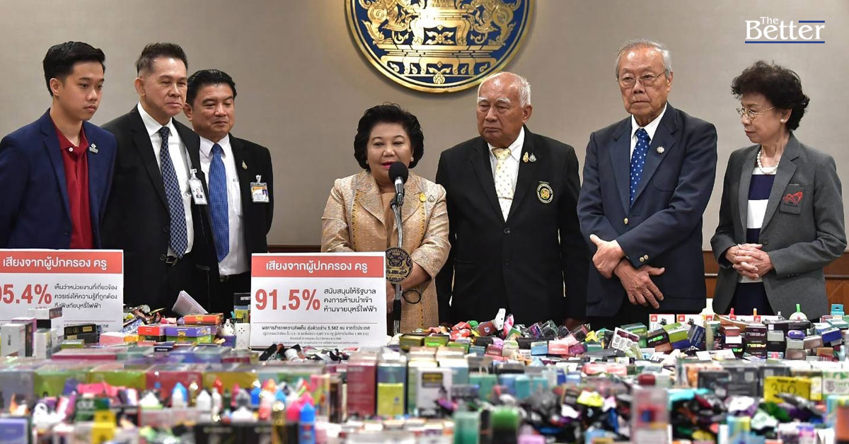 ดร.พวงเพ็ชร ชุนละเอียด รัฐมนตรีประจำสำนักนายกรัฐมนตรี พร้อมด้วย นายธสรณ์อัฑฒ์ ธนิทธิพันธ์ เลขาธิการคณะกรรมการคุ้มครองผู้บริโภค (สคบ.) ศ.เกียรติคุณ นพ.ประกิต วาทีสาธกกิจ ประธานมูลนิธิรณรงค์เพื่อการไม่สูบบุหรี่ ศ.พญ.สุวรรณา เรืองกาญจนเศรษฐ์ รอง ผอ.ศูนย์วิจัยและจัดการความรู้เพื่อควบคุมยาสูบ (สจย.) นายพชรพรรษ์ ประจวบลาภ เลขาธิการสถาบันยุวทัศน์แห่งประเทศไทย (ยท.) ร่วมแถลงข่าวการดำเนินการจับกุมร้านค้าที่ลักลอบจำหน่ายบุหรี่ไฟฟ้าบริเวณสถานศึกษาและพื้นที่ชุมชน จากการลงพื้นที่เมื่อช่วงค่ำที่ผ่านมา