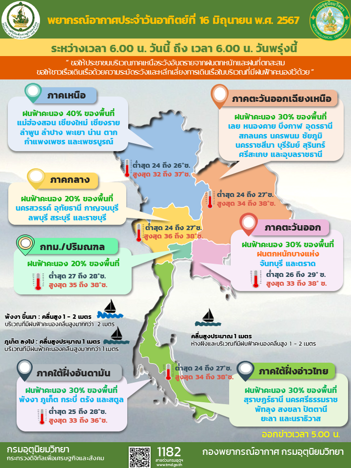 กรมอุตุนิยมวิทยา รายงาน ลักษณะอากาศทั่วไป ประจำวันที่ 16 มิถุนายน 2567 พยากรณ์อากาศ 24 ชั่วโมงข้างหน้า มรสุมตะวันตกเฉียงใต้พัดปกคลุมทะเลอันดามัน ประเทศไทย และอ่าวไทย ประกอบกับมีหย่อมความกดอากาศต่ำปกคลุมบริเวณชายฝั่งประเทศเวียดนามตอนบนและอ่าวตังเกี๋ย ลักษณะเช่นนี้ทำให้ประเทศไทยมีฝนฟ้าคะนองเกิดขึ้นได้บางพื้นที่ และมีฝนตกหนักบางแห่งในภาคตะวันออก