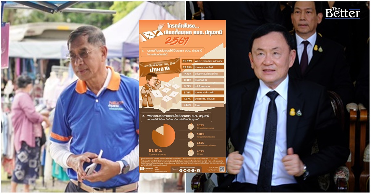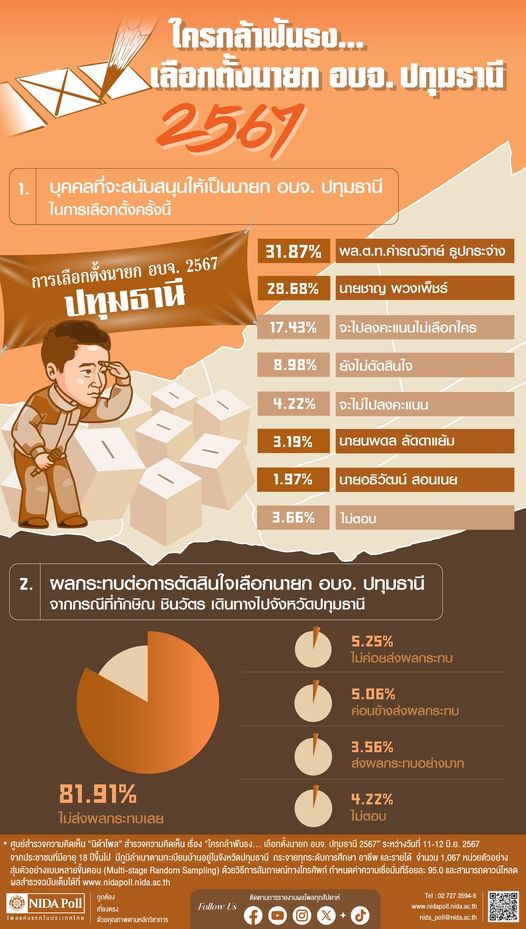 ศูนย์สำรวจความคิดเห็น “นิด้าโพล” สถาบันบัณฑิตพัฒนบริหารศาสตร์ (นิด้า) เปิดเผยผลการสำรวจของประชาชน เรื่อง “ใครกล้าฟันธง...เลือกตั้งนายก อบจ. ปทุมธานี 2567” ทำการสำรวจระหว่างวันที่ 11-12 มิถุนายน 2567 จากประชาชนที่มีอายุ 18 ปีขึ้นไป ซึ่งมีภูมิลำเนาตามทะเบียนบ้านอยู่ในจังหวัดปทุมธานี กระจายทุกระดับการศึกษา อาชีพ และรายได้ รวมทั้งสิ้น จำนวน 1,067 หน่วยตัวอย่าง เกี่ยวกับการเลือกตั้งนายกองค์การบริหารส่วนจังหวัดปทุมธานี ซึ่งสํานักงานคณะกรรมการการเลือกตั้ง (กกต.) ได้กำหนดวันลงคะแนนเสียงเลือกตั้งในวันอาทิตย์ที่ 30 มิถุนายน 2567 การสำรวจอาศัยการสุ่มตัวอย่างโดยใช้ความน่าจะเป็นจากบัญชีรายชื่อฐานข้อมูลตัวอย่างหลัก (Master Sample) ของ “นิด้าโพล” สุ่มตัวอย่างแบบหลายขั้นตอน (Multi-stage Sampling) เก็บข้อมูลด้วยวิธีการสัมภาษณ์ทางโทรศัพท์ โดยกำหนดค่าความเชื่อมั่น ร้อยละ 95.0