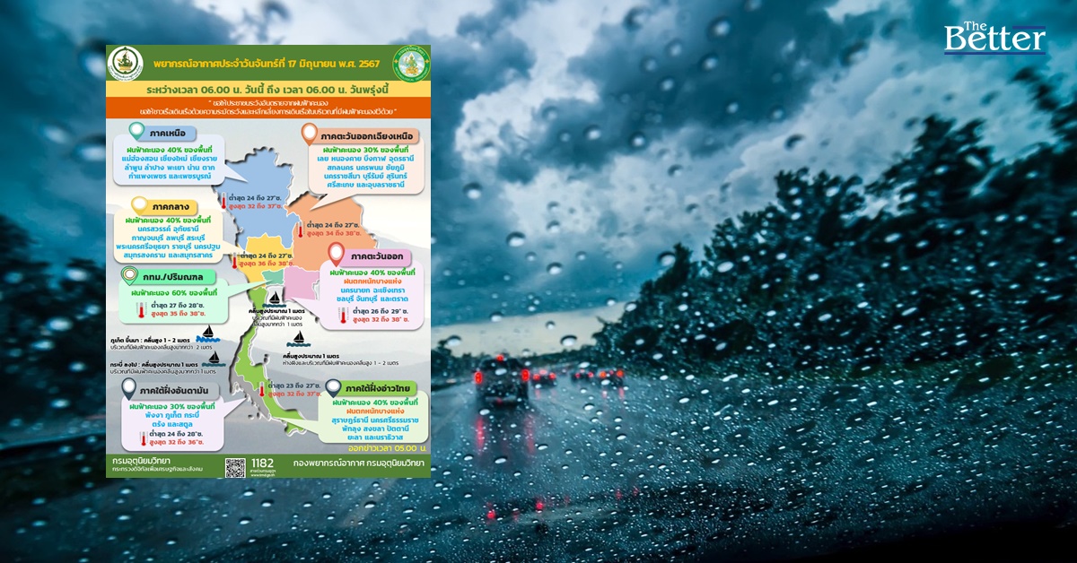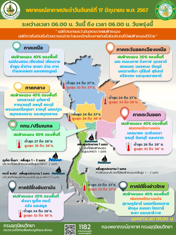 กรมอุตุนิยมวิทยา รายงาน ลักษณะอากาศทั่วไป ประจำวันที่ 17 มิถุนายน 2567 พยากรณ์อากาศ 24 ชั่วโมงข้างหน้า มรสุมตะวันตกเฉียงใต้พัดปกคลุมทะเลอันดามัน ประเทศไทย และอ่าวไทย ประกอบกับมีหย่อมความกดอากาศต่ำปกคลุมบริเวณชายฝั่งประเทศเวียดนามตอนบนและอ่าวตังเกี๋ย ลักษณะเช่นนี้ทำให้ประเทศไทยมีฝนฟ้าคะนองเกิดขึ้นได้บางพื้นที่ และมีฝนตกหนักบางแห่งในภาคตะวันออก และภาคใต้ฝั่งตะวันออก ขอให้ประชาชนระวังอันตรายจากฝนฟ้าคะนอง