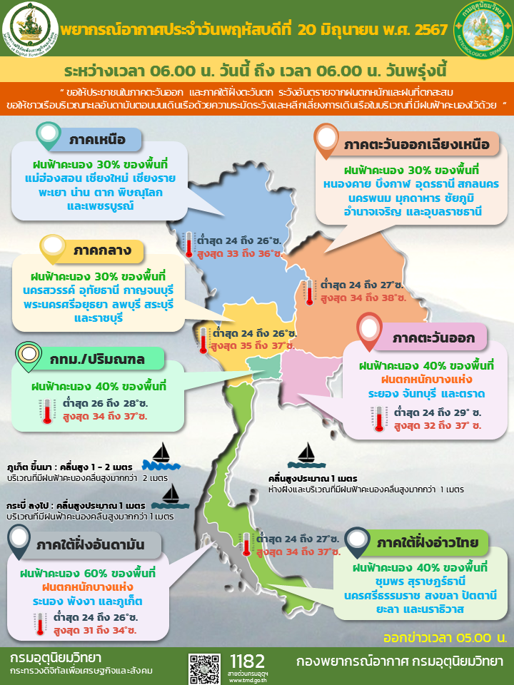 กรมอุตุนิยมวิทยา รายงาน ลักษณะอากาศทั่วไป ประจำวันที่ 20 มิถุนายน 2567 พยากรณ์อากาศ 24 ชั่วโมงข้างหน้า มรสุมตะวันตกเฉียงใต้พัดปกคลุมทะเลอันดามัน ประเทศไทย และอ่าวไทย ประกอบกับมีหย่อมความกดอากาศต่ำปกคลุมบริเวณชายฝั่งประเทศเวียดนามตอนบนและอ่าวตังเกี๋ย ลักษณะเช่นนี้ทำให้ประเทศไทยมีฝนฟ้าคะนองเกิดขึ้นได้บางพื้นที่ และมีฝนตกหนักบางแห่งในภาคตะวันออก และภาคใต้ฝั่งตะวันตก ขอให้ประชาชนในบริเวณดังกล่าวระวังอันตรายจากฝนตกหนักและฝนที่ตกสะสม
