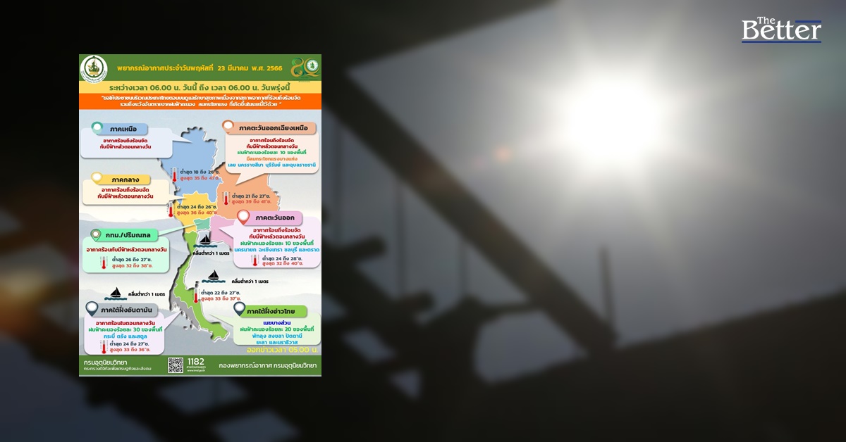 กรมอุตุนิยมวิทยา รายงาน ลักษณะอากาศทั่วไปประจำวันที่ 23 มีนาคม 2566 พยากรณ์อากาศ 24 ชั่วโมงข้างหน้า ความกดอากาศต่ำเนื่องจากความร้อนปกคลุมประเทศไทยตอนบน ลักษณะเช่นนี้ทำให้บริเวณดังกล่าวมีอากาศร้อนโดยทั่วไปกับมีฟ้าหลัวในตอนกลางวัน และมีอากาศร้อนจัดบางพื้นที่ ในขณะที่ลมใต้และลมตะวันออกเฉียงใต้ยังคงพัดปกคลุมภาคตะวันออกเฉียงเหนือตอนล่าง ภาคกลาง และภาคตะวันออก ทำให้ภาคตะวันออกเฉียงเหนือตอนล่าง และภาคตะวันออกมีฝนฟ้าคะนอง กับมีลมกระโชกแรงบางแห่ง ขอให้ประชาชนในบริเวณดังกล่าวดูแลรักษาสุขภาพเนื่องจากสภาพอากาศที่ร้อนถึงร้อนจัด รวมถึงระวังอันตรายจากฝนฟ้าคะนอง และลมกระโชกแรงที่เกิดขึ้นในระยะนี้ไว้ด้วย