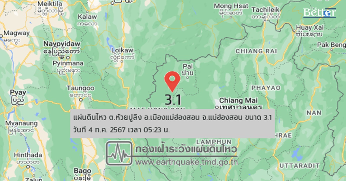 กองเฝ้าระวังแผ่นดินไหว กรมอุตุนิยมวิทยา รายงานว่า เวลา 05.23 น.วันที่ 4 ก.ค. 2567 เกิดเหตุแผ่นดินไหว ที่ ต.ห้วยปูลิง อ.เมืองแม่ฮ่องสอน จ.แม่ฮ่องสอน ขนาด 3.1 ความลึก 1 กิโลเมตร