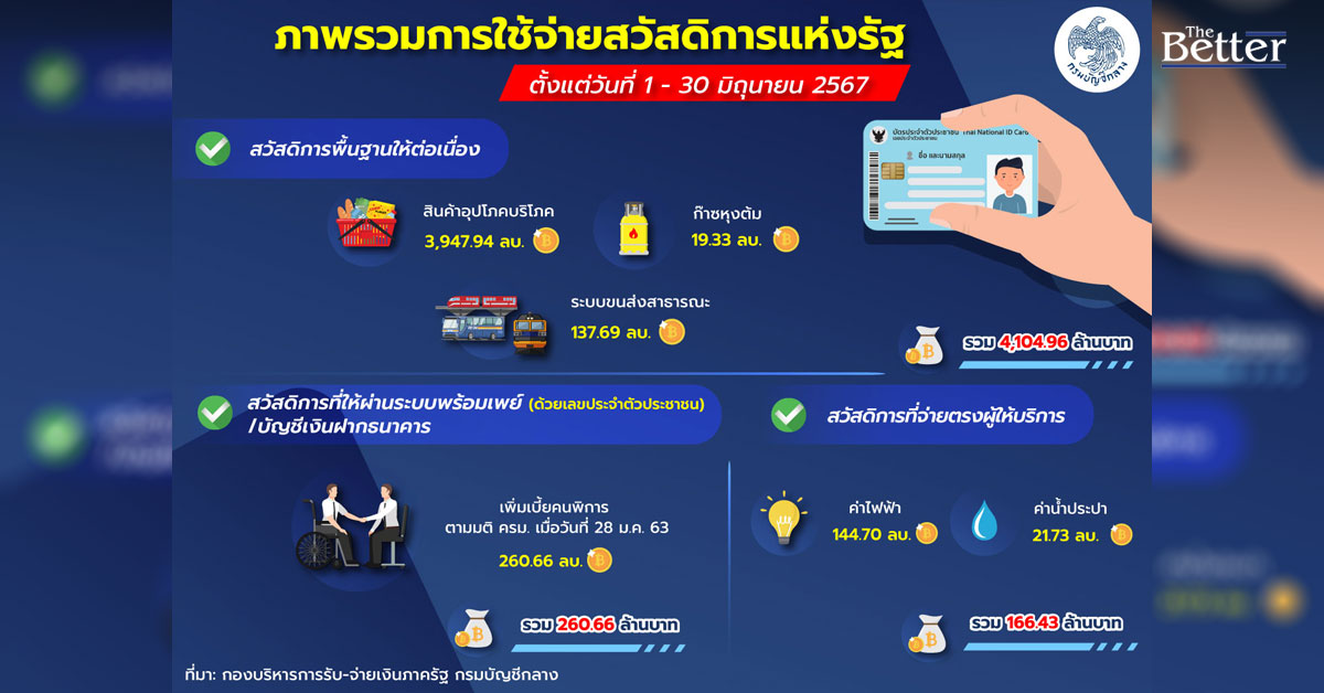 กรมบัญชีกลางขอรายงานผลการจ่ายเงินสวัสดิการแห่งรัฐ ข้อมูลตั้งแต่วันที่ 1 - 30 มิถุนายน 2567 ดังนี้