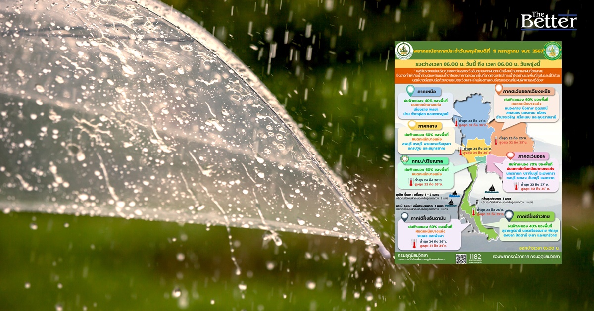 กรมอุตุนิยมวิทยา รายงาน ลักษณะอากาศทั่วไป ประจำวันที่ 11 กรกฎาคม 2567 พยากรณ์อากาศ 24 ชั่วโมงข้างหน้า มรสุมตะวันตกเฉียงใต้พัดปกคลุมทะเลอันดามัน ประเทศไทย และอ่าวไทย ประกอบกับมีหย่อมความกดอากาศต่ำปกคลุมบริเวณประเทศเวียดนามตอนบน ลักษณะเช่นนี้ทำให้ประเทศไทยมีฝนฟ้าคะนองและมีฝนตกหนักบางแห่ง โดยมีฝนตกหนักมากบางพื้นที่ในภาคตะวันออก ขอให้ประชาชนในบริเวณดังกล่าวระวังอันตรายจากฝนตกหนักถึงหนักมากและฝนที่ตกสะสม ซึ่งอาจทำให้เกิดน้ำท่วมฉับพลันและน้ำป่าไหลหลาก โดยเฉพาะพื้นที่ลาดเชิงเขาใกล้ทางน้ำไหลผ่านและพื้นที่ลุ่มในระยะนี้ไว้ด้วย