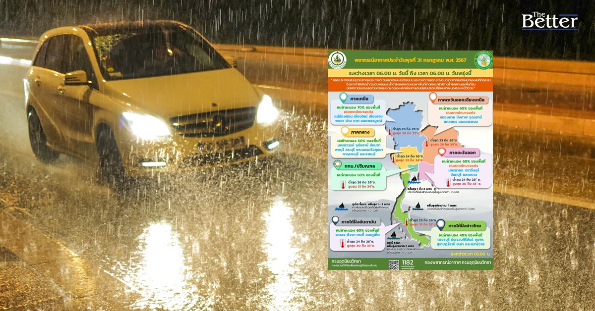 กรมอุตุนิยมวิทยา รายงาน ลักษณะอากาศทั่วไป ประจำวันที่ 31 กรกฎาคม 2567 พยากรณ์อากาศ 24 ชั่วโมงข้างหน้า ร่องมรสุมกำลังปานกลางพาดผ่านตอนบนของภาคเหนือ และประเทศลาวตอนบน เข้าสู่หย่อมความกดอากาศต่ำบริเวณประเทศเวียดนามตอนบน ประกอบกับมรสุมตะวันตกเฉียงใต้กำลังปานกลางยังคงพัดปกคลุมทะเลอันดามันตอนบน ประเทศไทย และอ่าวไทยตอนบน ลักษณะเช่นนี้ทำให้ภาคเหนือ ภาคตะวันออกเฉียงเหนือตอนบน และภาคตะวันออกยังคงมีฝนตกหนักบางแห่ง ขอให้ประชาชนในบริเวณดังกล่าวระวังอันตรายจากฝนตกหนักและฝนที่ตกสะสมซึ่งอาจทำให้เกิดน้ำท่วมฉับพลันและน้ำป่าไหลหลาก โดยเฉพาะพื้นที่ลาดเชิงเขาใกล้ทางน้ำไหลผ่านและพื้นที่ลุ่ม