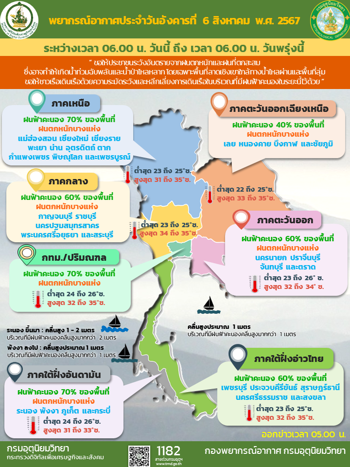 กรมอุตุนิยมวิทยา รายงาน ลักษณะอากาศทั่วไป ประจำวันที่ 06 สิงหาคม 2567 พยากรณ์อากาศ 24 ชั่วโมงข้างหน้า มรสุมตะวันตกเฉียงใต้ยังคงพัดปกคลุมทะเลอันดามัน ประเทศไทย และอ่าวไทย ประกอบกับมีหย่อมความกดอากาศต่ำบริเวณประเทศลาวและเวียดนามตอนบน ส่งผลให้ประเทศไทยยังคงมีฝนฟ้าคะนอง และมีฝนตกหนักบางแห่งในภาคเหนือ ภาคตะวันออกเฉียงเหนือ ภาคกลาง รวมทั้งกรุงเทพมหานครและปริมณฑล ภาคตะวันออก และภาคใต้ฝั่งตะวันตก ขอให้ประชาชนในบริเวณดังกล่าวระวังอันตรายจากฝนตกหนักและฝนที่ตกสะสม ซึ่งอาจทำให้เกิดน้ำท่วมฉับพลันและน้ำป่าไหลหลาก โดยเฉพาะพื้นที่ลาดเชิงเขาใกล้ทางน้ำไหลผ่านและพื้นที่ลุ่มไว้ด้วย