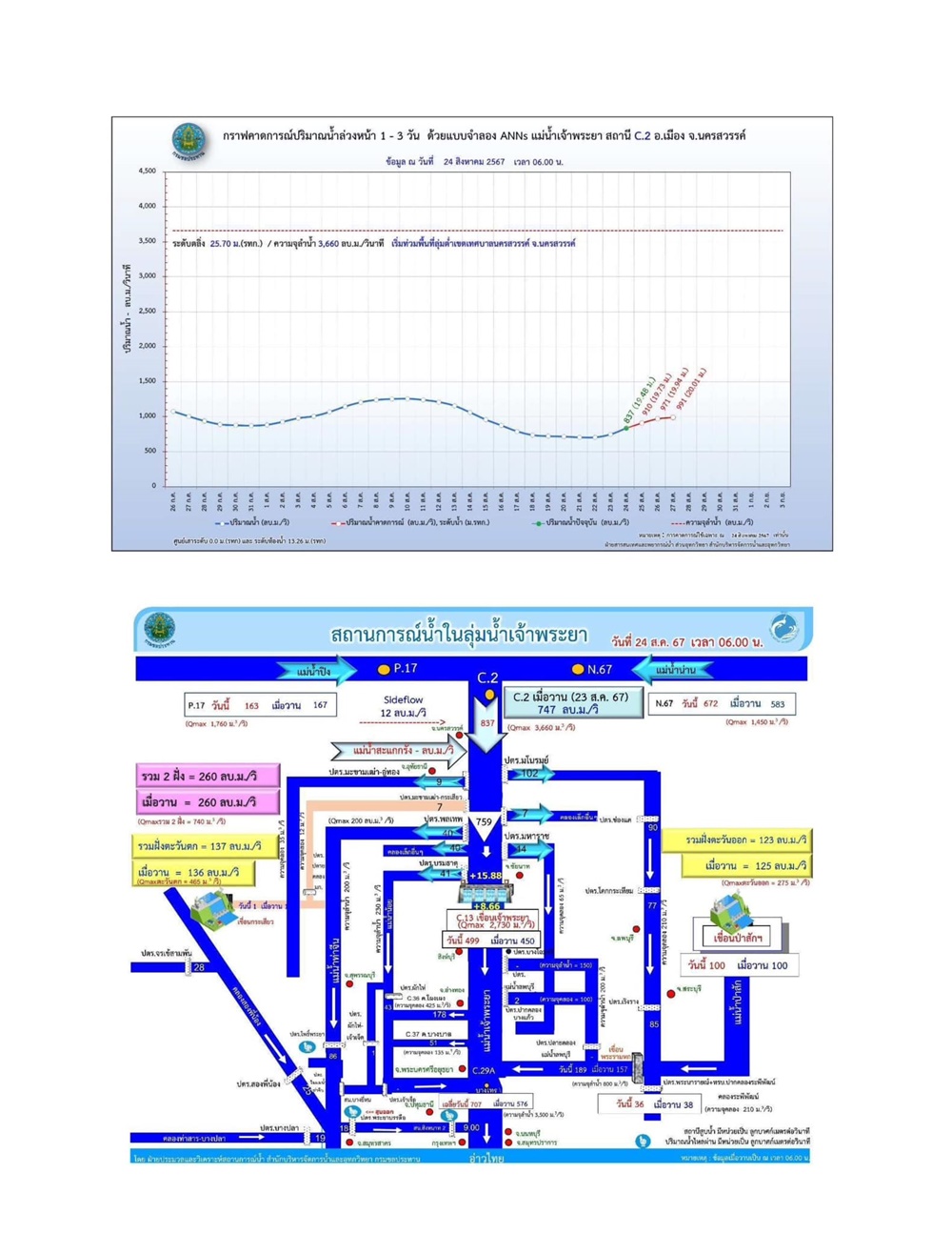นายไชยวัฒน์ จุนถิระพงศ์ อธิบดีกรมป้องกันและบรรเทาสาธารณภัย (ปภ.) เผย กรมป้องกันและบรรเทาสาธารณภัย (ปภ.) ในฐานะกองอำนวยการป้องกันและบรรเทาสาธารณภัยกลาง (กอปภ.ก.) ได้รับแจ้งจากกรมชลประทาน ว่า ในช่วงวันที่ 24 - 30 ส.ค. 2567 ประเทศไทยยังคงมีฝนตกต่อเนื่องและมีฝนตกหนักบางพื้นที่ บริเวณภาคเหนือ ภาคตะวันออกเฉียงเหนือตอนบน ภาคกลาง และภาคใต้ จากการคาดการณ์ปริมาณน้ำล่วงหน้า 1 - 3 วันข้างหน้า พบว่าปริมาณน้ำมีแนวโน้มเพิ่มขึ้น โดยในวันที่ 26 สิงหาคม 2567 ที่สถานี C.2 อำเภอเมืองนครสวรรค์ จังหวัดนครสวรรค์ มีปริมาณน้ำไหลผ่าน ประมาณ 1,000 ลูกบาศก์เมตรต่อวินาที และคาดการณ์ปริมาณน้ำจากลำน้ำสาขา ประมาณ 200 ลูกบาศก์เมตรต่อวินาที ซึ่งทำให้ปริมาณน้ำที่เหนือเขื่อนเจ้าพระยา มีปริมาณ 1,200 ลูกบาศก์เมตรต่อวินาที และรับน้ำเข้าระบบกรมชลประทานทั้ง 2 ฝั่ง ในอัตรา 300 ลูกบาศก์เมตรต่อวินาที จึงมีความจำเป็นต้องระบายน้ำผ่านท้ายเขื่อนเจ้าพระยา ในอัตราระหว่าง 700 - 900 ลูกบาศก์เมตรต่อวินาที ทำให้พื้นที่ลุ่มต่ำนอกคันกั้นน้ำบริเวณคลองโผงเผง จังหวัดอ่างทอง คลองบางบาล จังหวัดพระนครศรีอยุธยา และตำบลหัวเวียง อำเภอเสนา ตำบลลาดชิด ตำบลท่าดินแดง อำเภอผักไห่ จังหวัดพระนครศรีอยุธยา (แม่น้ำน้อย) มีระดับน้ำเพิ่มสูงขึ้นจากปัจจุบันอีกประมาณ 0.40 - 0.80 เมตร ตั้งแต่วันที่ 26 สิงหาคม 2567 เป็นต้นไป โดยไม่ส่งผลกระทบต่อพื้นที่ชุมชน