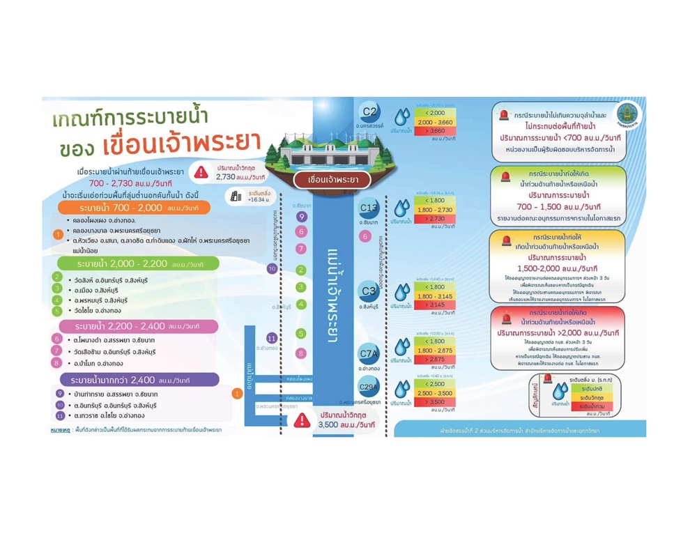 กองอำนวยการป้องกันและบรรเทาสาธารณภัยกลาง (กอปภ.ก.) จึงได้ประสาน 10 จังหวัดภาคกลาง ได้แก่ อุทัยธานี ชัยนาท สิงห์บุรี อ่างทอง สุพรรณบุรี พระนครศรีอยุธยา ลพบุรี ปทุมธานี นนทบุรี และสมุทรปราการ รวมถึงกรุงเทพมหานคร เฝ้าระวังติดตามสถานการณ์น้ำอย่างใกล้ชิด โดยเฉพาะพื้นที่ลุ่มต่ำนอกคันกั้นน้ำ พร้อมประชาสัมพันธ์แจ้งเตือนหน่วยงานที่เกี่ยวข้อง ภาคเอกชนที่ประกอบกิจการในแม่น้ำ อาทิ งานก่อสร้างเขื่อนป้องกันตลิ่ง แพร้านอาหาร ตลอดจนประชาสัมพันธ์แจ้งเตือนประชาชนที่อาศัยอยู่ริมสองฝั่งแม่น้ำเจ้าพระยา จุดเสี่ยงที่ลุ่มต่ำริมแม่น้ำให้เฝ้าระวังระดับน้ำที่เพิ่มสูงขึ้นและเตรียมพร้อมรับมือสถานการณ์น้ำ รวมถึงเตรียมพร้อมในการขนย้ายสิ่งของขึ้นที่สูงให้พ้นจากแนวน้ำท่วม นอกจากนี้ ยังได้ประสานองค์กรปกครองส่วนท้องถิ่นและหน่วยงานที่เกี่ยวข้องในพื้นที่ ตรวจสอบแนวคันกั้นน้ำและแนวป้องกันน้ำท่วมให้มีความแข็งแรง เพื่อป้องกันระดับน้ำล้นข้ามแนวคันกั้นน้ำ อีกทั้งจัดเตรียมวัสดุอุปกรณ์ เครื่องจักรกลด้านสาธารณภัย เพื่อเตรียมความพร้อมปฏิบัติการให้ความช่วยเหลือประชาชนตลอด 24 ชั่วโมง