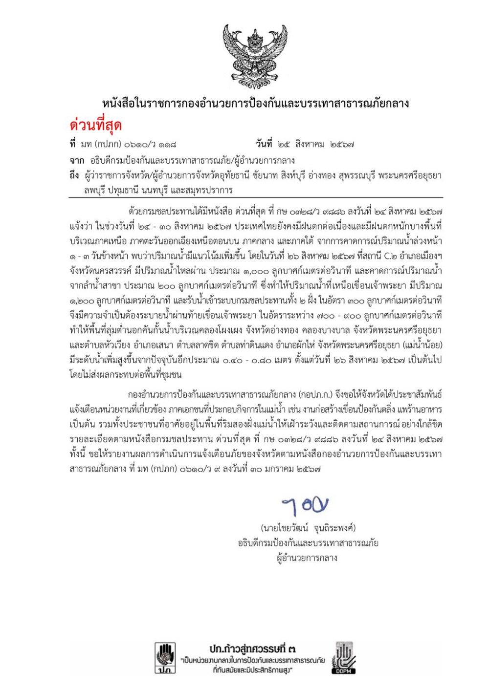 กรมป้องกันฯ ประสาน 10 จังหวัดภาคกลาง และ กทม. เฝ้าระวังระดับน้ำในแม่น้ำเจ้าพระยาเพิ่มสูงขึ้น ตั้งแต่วันที่ 26 ส.ค. 67 หลังฝนยังตกหนัก