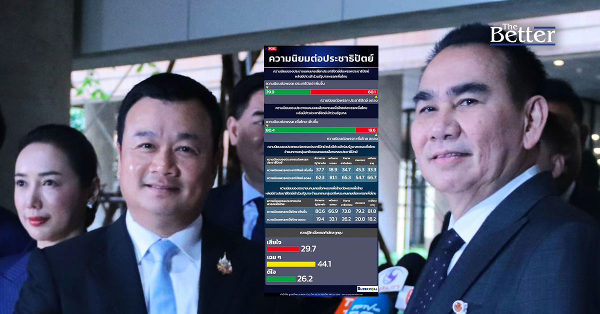 “ซูเปอร์โพล” เผยสำรวจปชป.คะแนนนิยมลดลง หลังร่วมรัฐบาล สวนทางเพื่อไทยได้คะแนนเพิ่มขึ้น ส่วนปมยุบก้าวไกล ประชาชนรู้สึกเฉยๆ