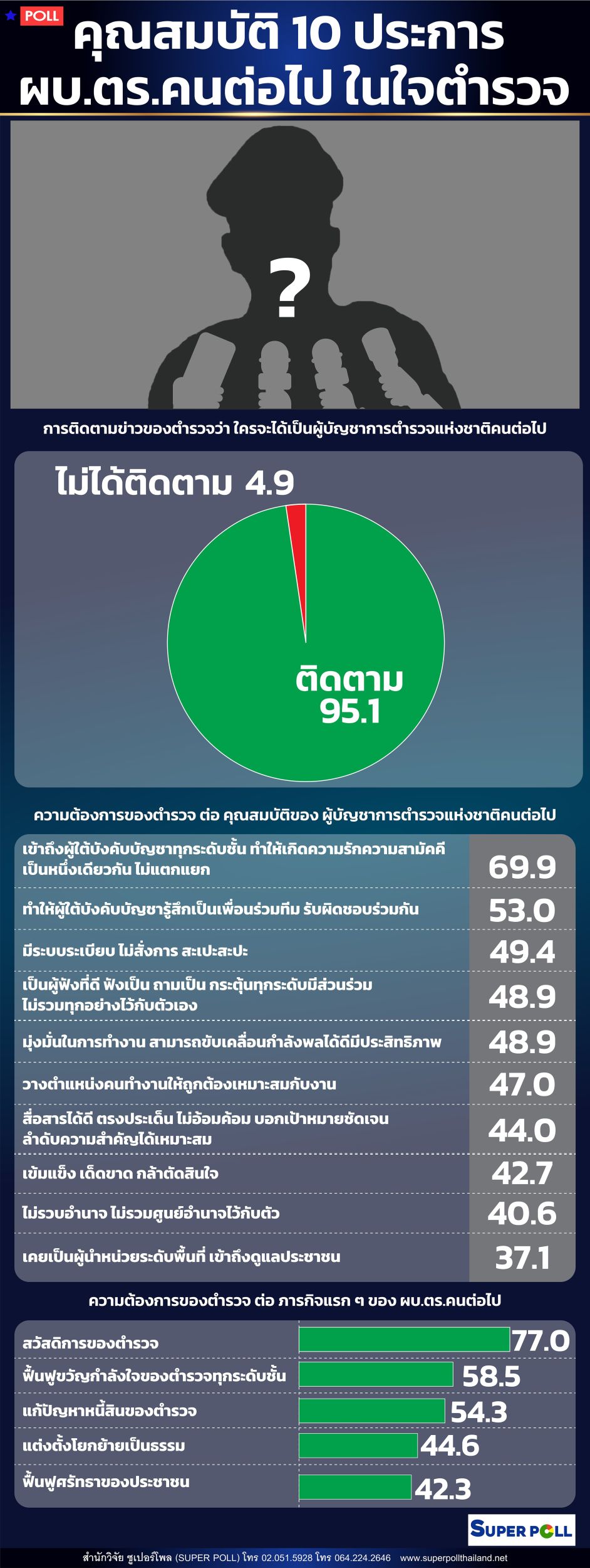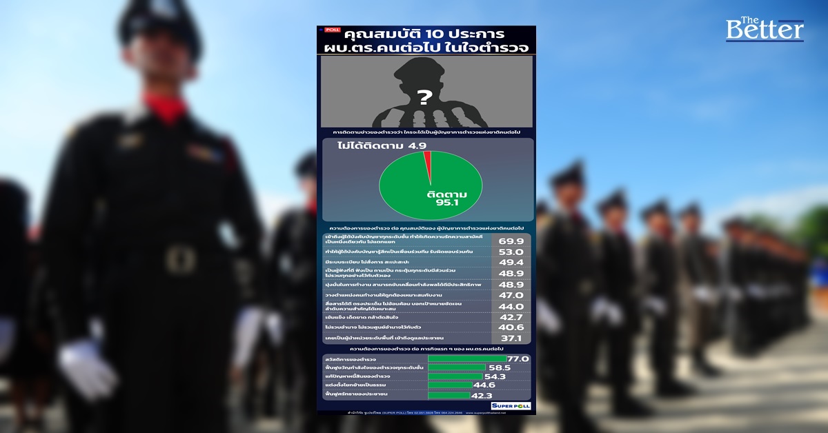 ซูเปอร์โพล คุณสมบัติ 10 ประการ ผบ.ตร.คนต่อไป ในใจตำรวจ อันดับ 1 เข้าถึงผู้ใต้บังคับบัญชาทุกระดับชั้น ขณะที่ภารกิจ อยากให้ดูเรื่องสวัสดิการ