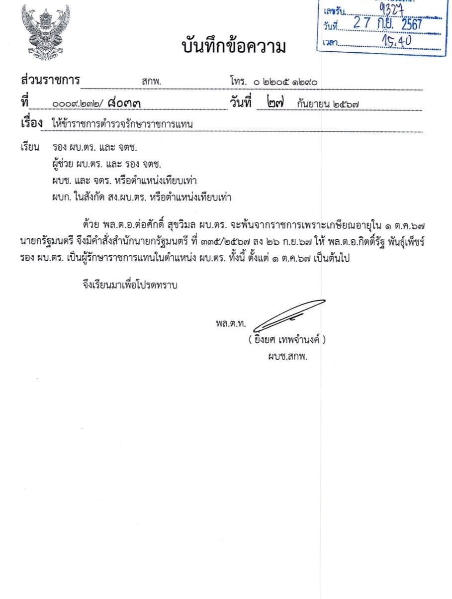 ใจความว่า ด้วย พล.ต.อ.ต่อศักดิ์ สุขวิมล ผบ.ตร. จะพ้นจากราชการเพราะเกษียณอายุ 1 ต.ค. 67 นายกรัฐมนตรี จึงมีคำสั่งสำนักนายกรัฐมนตรี ที่ 335/2567 ลงวันที่ 26 ก.ย.67 ให้ พล.ต.อ.กิตติ์รัฐ พันธุ์เพ็ชร์ รอง ผบ.ตร. เป็นผู้รักษาราชการแทนในตำแหน่ง ผบ.ตร. ทั้งนี้ ตั้งแต่ 1 ต.ค.67 เป็นต้นไป จึงเรียนมาเพื่อโปรดทราบ
