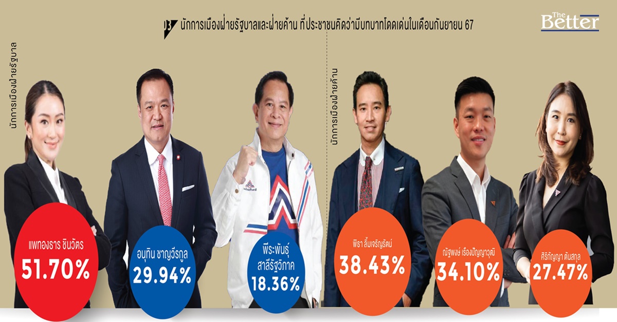 ตัวชี้วัดที่ได้คะแนนสูงสุด คือ ผลงานของฝ่ายค้าน เฉลี่ย 5.41 คะแนน เพิ่มขึ้นจากเดือนสิงหาคม ตัวชี้วัดที่ได้คะแนนต่ำสุด คือ การแก้ปัญหาความยากจน เฉลี่ย 4.32 คะแนน นักการเมืองฝ่ายรัฐบาลที่มีบทบาทโดดเด่นประจำเดือน คือ น.ส.แพทองธาร ชินวัตร ร้อยละ 51.70 รองลงมาคือ นายอนุทิน ชาญวีรกูล ร้อยละ 29.94