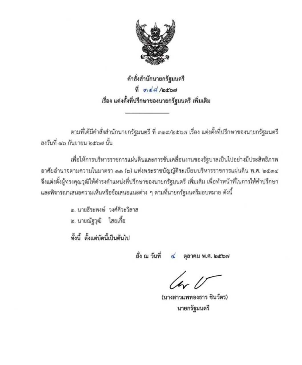 น.ส.แพทองธาร ชินวัตร นายกรัฐมนตรี ลงนามในคำสั่งสำนักนายกรัฐมนตรี ที่ 348/2567 เรื่อง แต่งตั้งที่ปรึกษาของนายกรัฐนตรี เพิ่มเติม