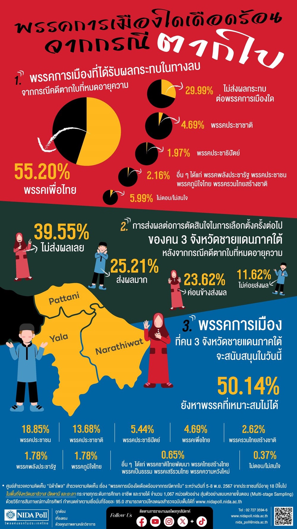 นิด้าโพล เผย คน 3 จังหวัดใต้ 55.20 % ชี้ "เพื่อไทย" ได้รับผลกระทบหนักจากคดีตากใบหมดอายุ 50.14% บอกเลือกตั้งครั้งหน้าจะเลือกพรรคไหน