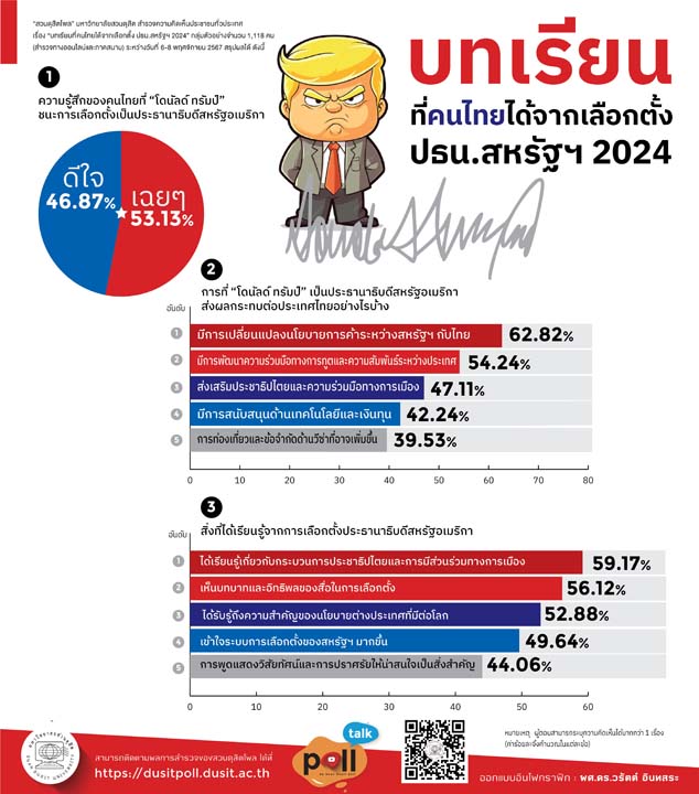 “สวนดุสิตโพล” มหาวิทยาลัยสวนดุสิต สำรวจความคิดเห็นประชาชนทั่วประเทศ เรื่อง “บทเรียนที่คนไทยได้จากเลือกตั้ง ปธน.สหรัฐฯ 2024” กลุ่มตัวอย่างจำนวน 1,118 คน (สำรวจทางออนไลน์และภาคสนาม) ระหว่างวันที่ 6-8 พฤศจิกายน 2567 สรุปผลได้ ดังนี้