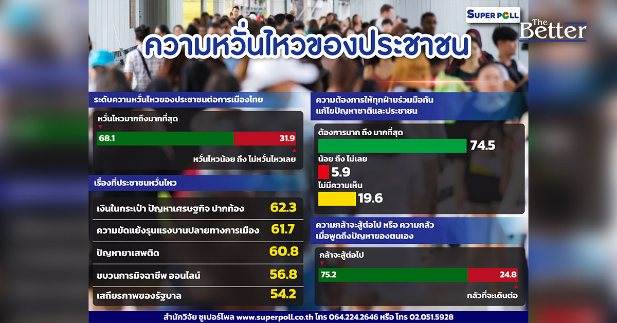 ซูเปอร์โพล เผย ประชาชน หวั่นไหวมากถึงมากที่สุดต่อการเมืองไทย ห่วงกระทบเศรษฐกิจและปัญหาเงินในกระเป๋า