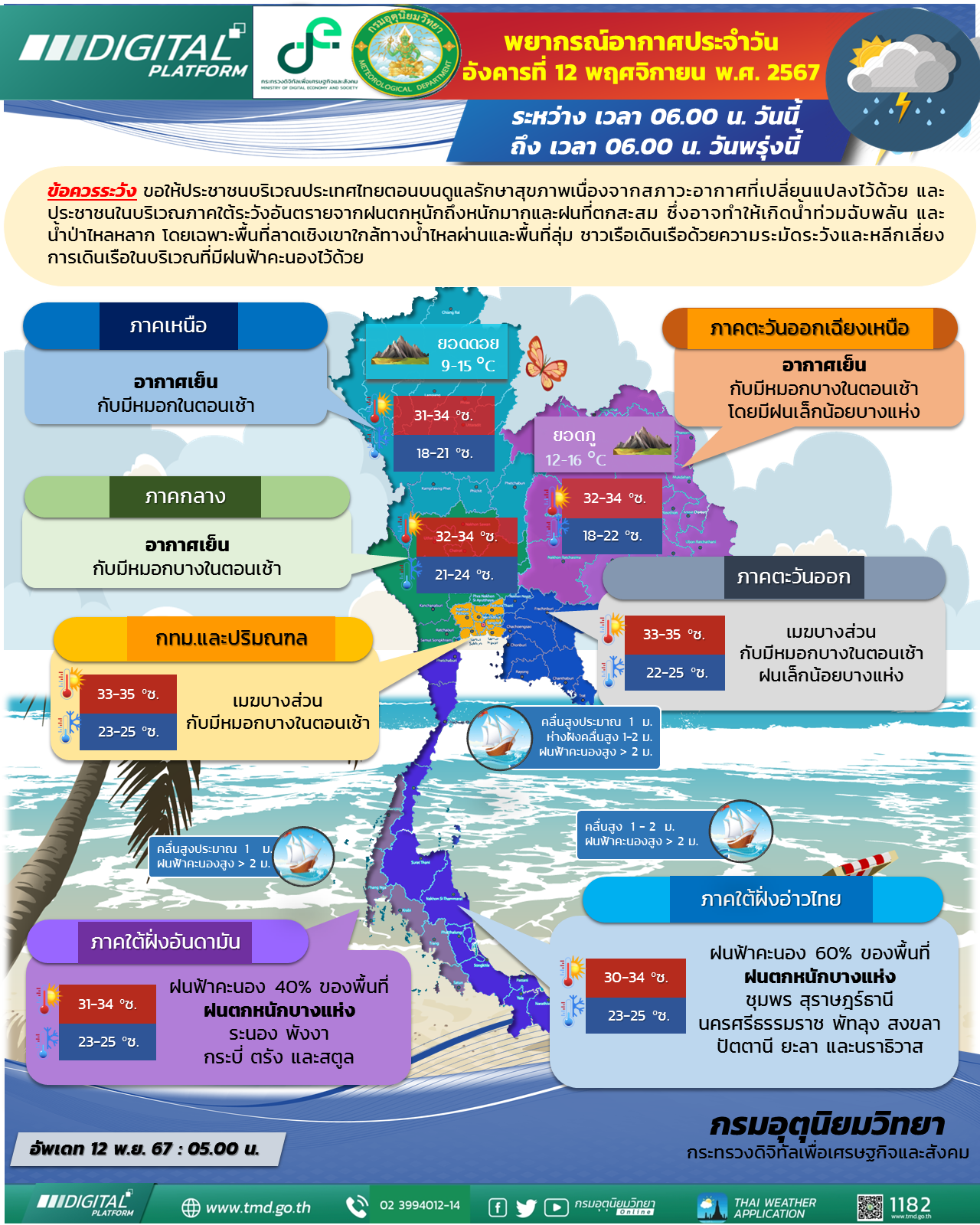 ลักษณะอากาศทั่วไป ประจำวันที่ 12 พฤศจิกายน 2567 พยากรณ์อากาศ 24 ชั่วโมงข้างหน้า บริเวณความกดอากาศสูงหรือมวลอากาศเย็นจากประเทศจีนที่ปกคลุมประเทศไทยตอนบน และทะเลจีนใต้เริ่มมีกำลังอ่อนลง แต่ยังคงทำให้บริเวณดังกล่าวมีอากาศเย็นกับมีหมอกในตอนเช้า ขอให้ประชาชนบริเวณประเทศไทยตอนบนดูแลรักษาสุขภาพเนื่องจากสภาวะอากาศที่เปลี่ยนแปลงไว้ด้วย