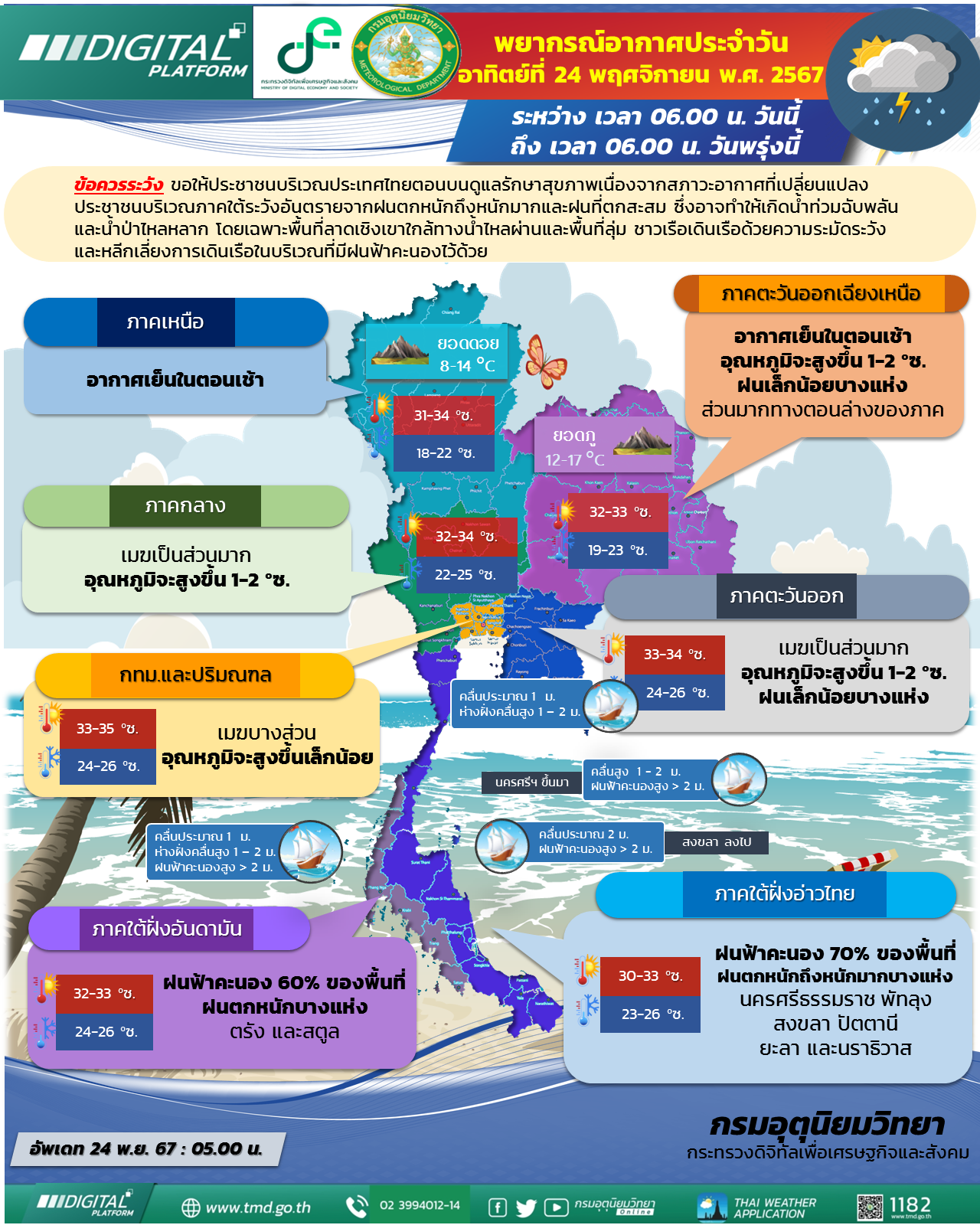 กรมอุตุนิยมวิทยา รายงาน ลักษณะอากาศทั่วไป ประจำวันที่ 24 พฤศจิกายน 2567 พยากรณ์อากาศ 24 ชั่วโมงข้างหน้า บริเวณความกดอากาศสูงหรือมวลอากาศเย็นกำลังปานกลางที่ปกคลุมประเทศไทยตอนบนและทะเลจีนใต้เริ่มมีกำลังอ่อนลง ลักษณะเช่นนี้ทำให้ประเทศไทยตอนบนมีอุณหภูมิสูงขึ้น แต่ยังคงทำให้ภาคเหนือและภาคตะวันออกเฉียงเหนือมีอากาศเย็นในตอนเช้า โดยมีฝนเล็กน้อยบางแห่งในภาคตะวันออกเฉียงเหนือตอนล่าง และภาคตะวันออก ขอให้ประชาชนบริเวณประเทศไทยตอนบนดูแลรักษาสุขภาพเนื่องจากสภาวะอากาศที่เปลี่ยนแปลงไว้ด้วย