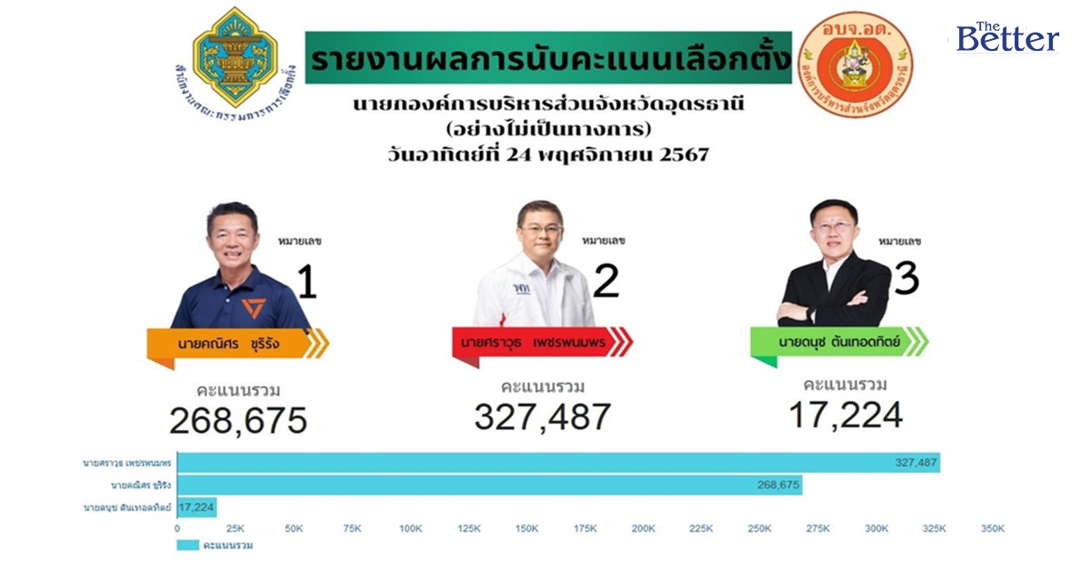 ผลการนับคะแนนอย่างไม่เป็นทางการ การเลือกตั้งนายกองค์การบริหารส่วนจังหวัด (อบจ.) อุดรธานี ปรากฏว่า นายคณิศร ขุริรัง ผู้สมัครหมายเลข 1 จากพรรคประชาชน ได้คะแนนรวม 268,675 คะแนน นายศราวุธ เพชรพนมพร ผู้สมัครหมายเลข 2 จากพรรคเพื่อไทย ได้คะแนนรวม 327,487 คะแนน และนายดนุช ตันเทอดทิตย์ ผู้สมัครหมายเลข 3 ในนามผู้สมัครอิสระ ได้คะแนนรวม 17,224 คะแนน
