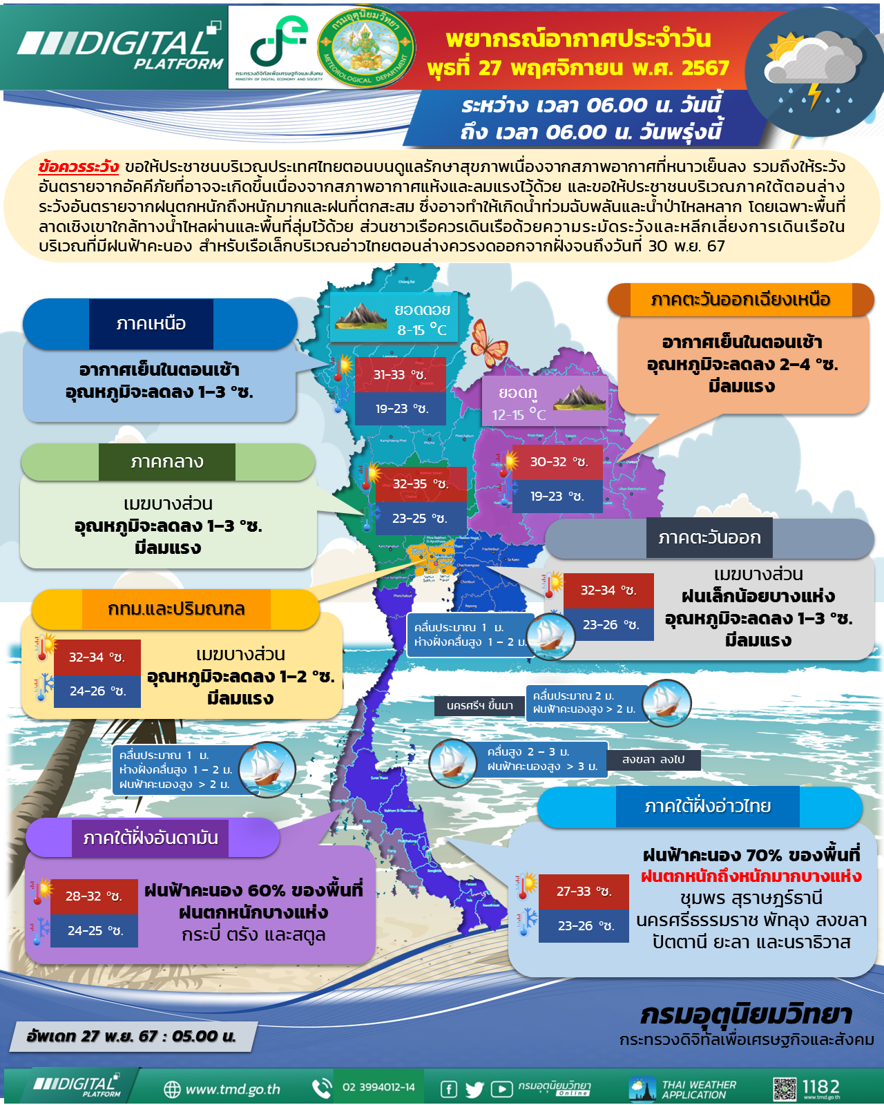 ประกาศกรมอุตุฯ ฉบับ 4 เตือน 27-30 พ.ย.ภาคใต้ฝนตกหนักมาก อ่าวไทยคลื่นลมแรง - ไทยตอนบนอากาศหนาวเย็น