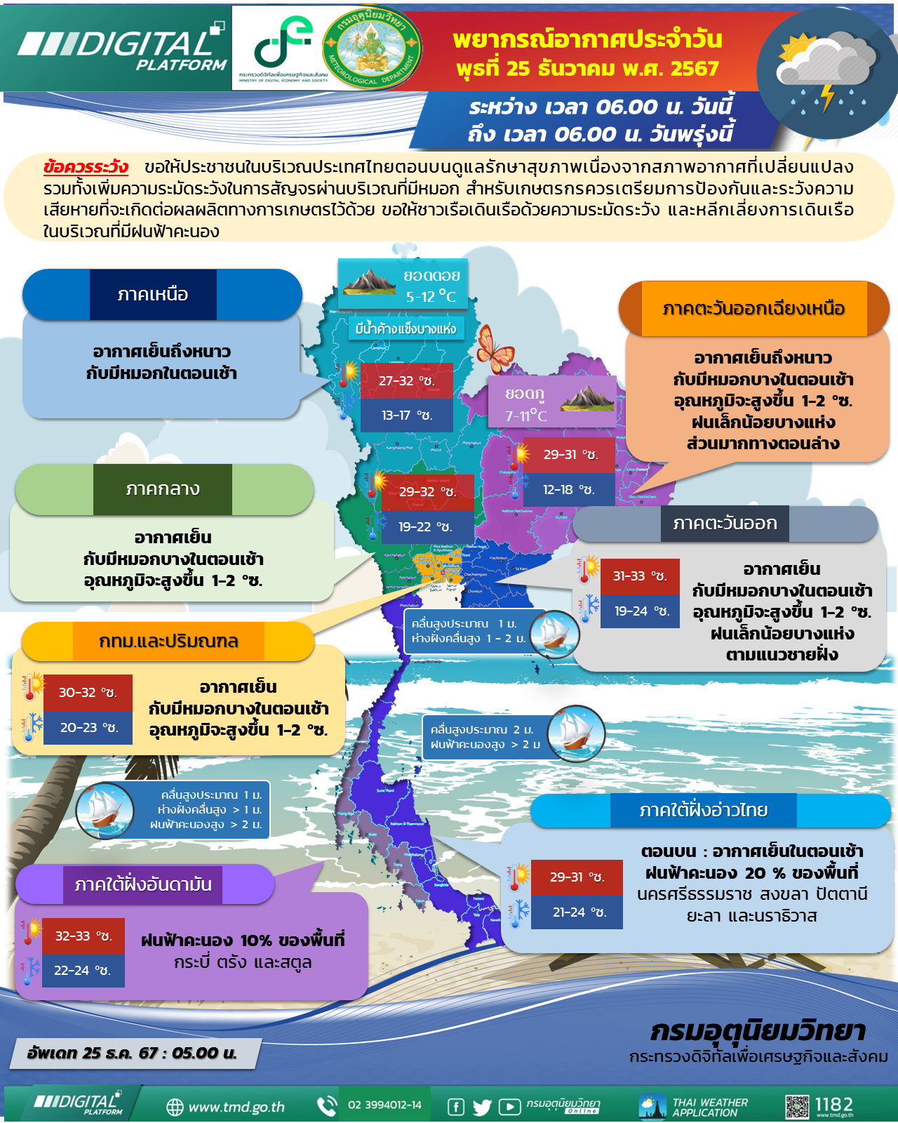 ภาคเหนือ อากาศเย็นถึงหนาวกับมีหมอกในตอนเช้าอุณหภูมิต่ำสุด 13-17 องศาเซลเซียส อุณหภูมิสูงสุด 27-32 องศาเซลเซียส บริเวณยอดดอยอากาศหนาวถึงหนาวจัดและมีน้ำค้างแข็งบางพื้นที่ อุณหภูมิต่ำสุด 5-12 องศาเซลเซียส ลมตะวันออกเฉียงเหนือ ความเร็ว 5-15 กม./ชม.