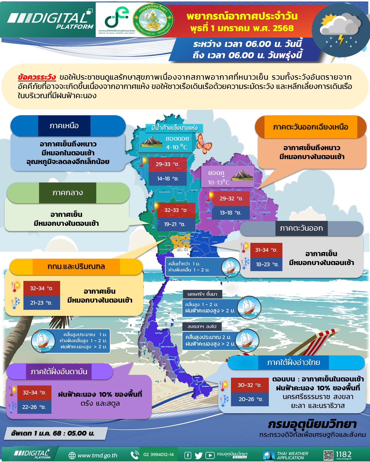 กรมอุตุนิยมวิทยา รายงาน ลักษณะอากาศทั่วไป ประจำวันที่ 01 มกราคม 2568 พยากรณ์อากาศ 24 ชั่วโมงข้างหน้า บริเวณความกดอากาศสูงหรือมวลอากาศเย็นกำลังปานกลางปกคลุมประเทศไทยตอนบน และภาคใต้ตอนบน ทำให้ภาคตะวันออกเฉียงเหนือและภาคเหนือมีอากาศเย็นถึงหนาว ส่วนภาคกลาง รวมทั้งกรุงเทพมหานครและปริมณฑล ภาคตะวันออก และภาคใต้ตอนบนมีอากาศเย็น สำหรับบริเวณยอดดอยและยอดภูมีอากาศหนาวถึงหนาวจัด ขอให้ประชาชนในบริเวณดังกล่าวดูแลรักษาสุขภาพเนื่องจากสภาพอากาศที่หนาวเย็น รวมทั้งระวังอันตรายจากอัคคีภัยที่อาจจะเกิดขึ้นเนื่องจากอากาศแห้ง