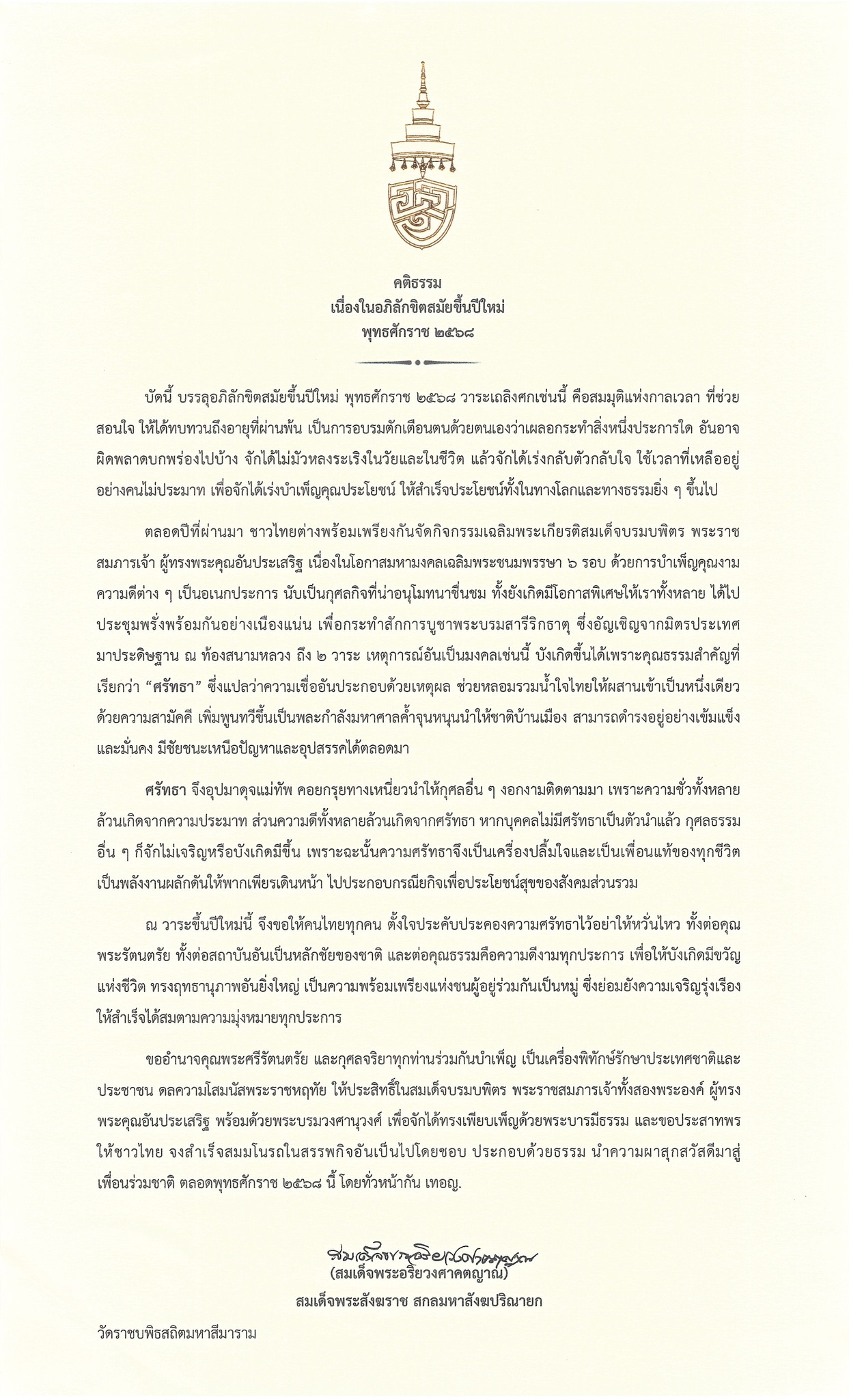 “บัดนี้ บรรลุอภิลักขิตสมัยขึ้นปีใหม่ พุทธศักราช ๒๕๖๘ วาระเถลิงศกเช่นนี้ คือสมมุติแห่งกาลเวลา ที่ช่วยสอนใจ ให้ได้ทบทวนถึงอายุที่ผ่านพ้น เป็นการอบรมตักเตือนตนด้วยตนเองว่าเผลอกระทำสิ่งหนึ่งประการใด อันอาจผิดพลาดบกพร่องไปบ้าง จักได้ไม่มัวหลงระเริงในวัยและในชีวิต แล้วจักได้เร่งกลับตัวกลับใจ ใช้เวลาที่เหลืออยู่อย่างคนไม่ประมาท เพื่อจักได้เร่งบำเพ็ญคุณประโยชน์ ให้สำเร็จประโยชน์ทั้งในทางโลกและทางธรรมยิ่ง ๆ ขึ้นไป