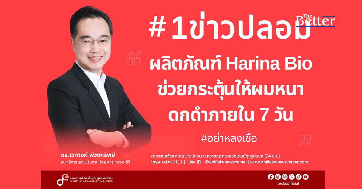 กระทรวงดิจิทัลเพื่อเศรษฐกิจและสังคม (ดีอี) ตรวจพบข่าวปลอมรายสัปดาห์ ที่ประชาชนให้ความสนใจสูงสุดอันดับที่ 1 เรื่อง “ผลิตภัณฑ์ Harina Bio ช่วยกระตุ้นให้ผมหนา ดกดำภายใน 7 วัน” รองลงมาคือเรื่อง “กินลูกปลาช่อนสด ช่วยสมานแผลหลังผ่าตัด” โดยขอให้ประชาชน อย่าหลงเชื่อข่าวปลอม เลือกเชื่อ เลือกแชร์ ข้อมูลที่เป็นประโยชน์ หวั่นสร้างความสับสน ความเข้าใจผิด และมีผลกระทบต่อสุขภาพของประชาชน ซึ่งจะส่งผลกระทบต่อในสังคมเป็นวงกว้าง