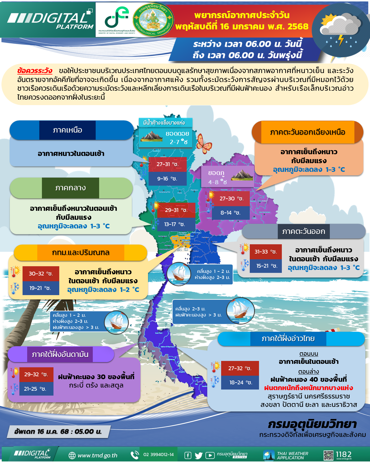 ลักษณะอากาศทั่วไป วันที่ 16 มกราคม 2568 พยากรณ์อากาศ 24 ชั่วโมงข้างหน้า บริเวณความกดอากาศสูงหรือมวลอากาศเย็นกำลังค่อนข้างแรงระลอกใหม่จากประเทศจีนได้แผ่ปกคลุมภาคตะวันออกเฉียงเหนือตอนบนแล้ว และจะแผ่ปกคลุมประเทศไทยตอนบนทั้งหมดภายในวันนี้ (16 ม.ค. 68) ส่งผลให้ประเทศไทยตอนบนมีอากาศเย็นถึงหนาวกับมีลมแรง โดยมีอุณหภูมิลดลง 1-3 องศาเซลเซียส สำหรับบริเวณยอดดอยและยอดภูมีอากาศหนาว ขอให้ประชาชนบริเวณประเทศไทยดูแลรักษาสุขภาพเนื่องจากสภาพอากาศที่หนาวเย็น และระวังอันตรายจากอัคคีภัยที่อาจจะเกิดขึ้น เนื่องจากอากาศแห้ง รวมทั้งระมัดระวังการสัญจรผ่านบริเวณที่มีหมอกไว้ด้วย