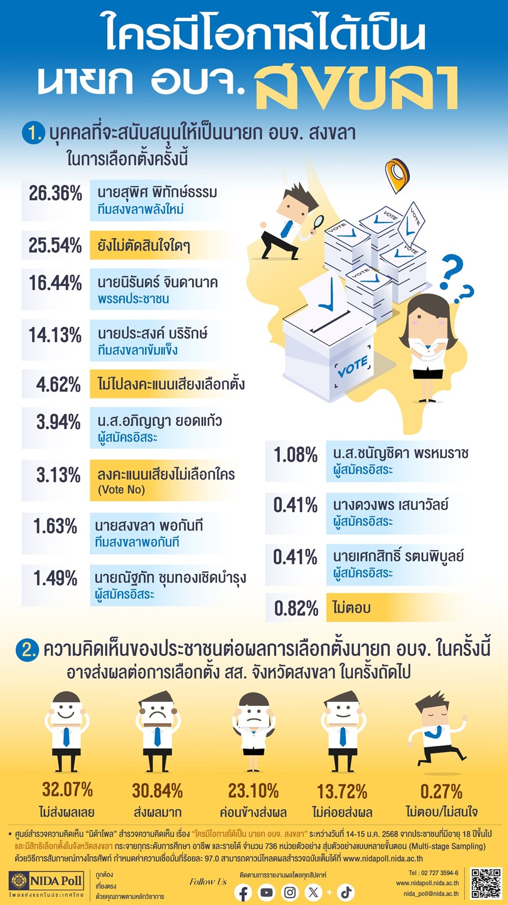 ศูนย์สำรวจความคิดเห็น “นิด้าโพล” สถาบันบัณฑิตพัฒนบริหารศาสตร์ (นิด้า) เปิดเผยผลการสำรวจของประชาชน เรื่อง “ใครมีโอกาสได้เป็นนายก อบจ. สงขลา” ทำการสำรวจระหว่างวันที่ 14-15 มกราคม 2568 จากประชาชนที่มีอายุ 18 ปีขึ้นไป และมีสิทธิเลือกตั้งในจังหวัดสงขลา กระจายทุกระดับการศึกษา อาชีพ และรายได้ รวมจำนวนทั้งสิ้น 736 หน่วยตัวอย่าง เกี่ยวกับการเลือกตั้งนายกองค์การบริหารส่วนจังหวัดสงขลา การสำรวจอาศัยการสุ่มตัวอย่างโดยใช้ความน่าจะเป็นจากบัญชีรายชื่อฐานข้อมูลตัวอย่างหลัก (Master Sample) ของ “นิด้าโพล” สุ่มตัวอย่างแบบหลายขั้นตอน (Multi-stage Sampling) เก็บข้อมูลด้วยวิธีการสัมภาษณ์ทางโทรศัพท์ โดยกำหนดค่าความเชื่อมั่น ร้อยละ 97.0