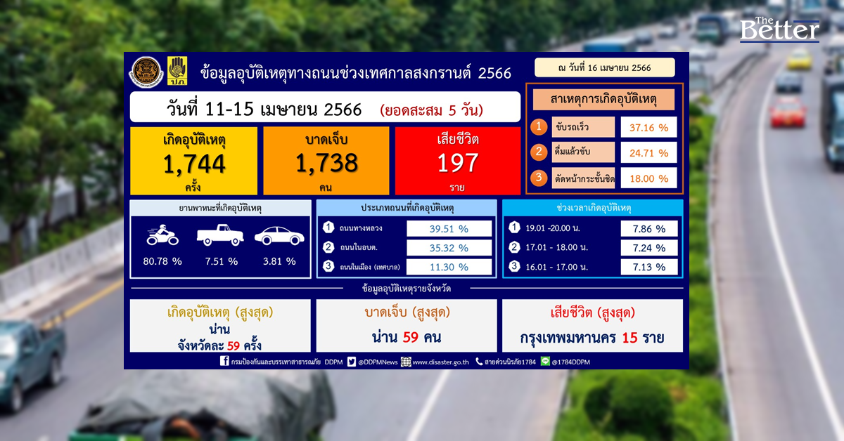 เมื่อช่วงเช้าที่ผ่านมา (16 เม.ย.66) ที่กรมป้องกันและบรรเทาสาธารณภัย ศูนย์อำนวยการป้องกันและลดอุบัติเหตุทางถนนช่วงเทศกาลสงกรานต์ พ.ศ. 2566 สรุปสถิติอุบัติเหตุทางถนนประจำวันที่ 15 เมษายน 2566 เกิดอุบัติเหตุ 311 ครั้ง / ผู้เสียชีวิต 31 ราย / ผู้บาดเจ็บ 304 คน // สถิติอุบัติเหตุสะสม 5 วัน ระหว่างวันที่ 11 - 15 เมษายน 2566 เกิดอุบัติเหตุรวม 1,744 ครั้ง / ผู้เสียชีวิต 197 ราย / ผู้บาดเจ็บ 1,738 คน โดยจังหวัดที่เกิดอุบัติเหตุสะสมสูงสุด ได้แก่ น่าน 59 ครั้ง จังหวัดที่มีผู้เสียชีวิตสะสมสูงสุด ได้แก่ กรุงเทพมหานคร 15 ราย และจังหวัดที่มีผู้บาดเจ็บสะสมสูงสุด ได้แก่ น่าน 59 คน จังหวัดที่ไม่มีผู้เสียชีวิต 7 จังหวัด