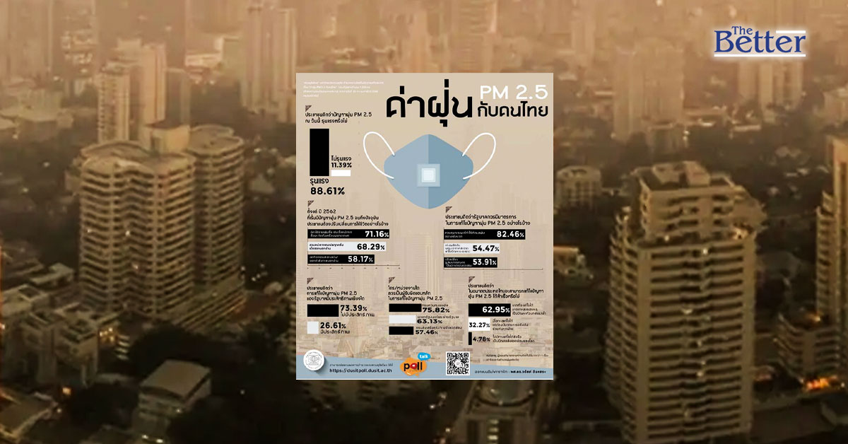สวนดุสิตโพล เผยความเห็นประชาชน ชี้ปัญหาฝุ่น PM2.5 ทำค่าใช้จ่ายเพิ่ม ซัดรัฐบาลไร้ประสิทธิภาพแก้ปัญหาระยะยาว ทำปัญหาวนกลับมาซ้ำ จี้คลุมการเผา ดันพ.ร.บ.อากาศสะอาด ปรับการเกษตรที่เป็นมิตรต่อสิ่งแวดล้อม