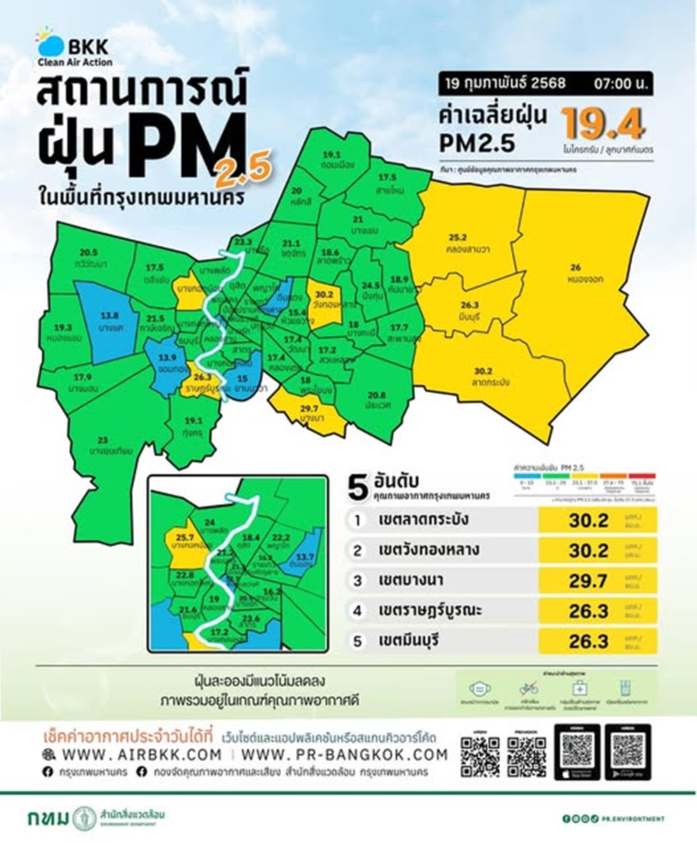 ศูนย์ข้อมูลคุณภาพอากาศกรุงเทพมหานคร ขอรายงานสถานการณ์ฝุ่นละอองขนาดไม่เกิน 2.5 ไมครอน (PM 2.5) ในกรุงเทพมหานคร ประจำวันที่ 19 กุมภาพันธ์ 2568 เวลา 07.00 น. ค่าเฉลี่ยของกรุงเทพมหานคร 19.4 ไมโครกรัมต่อลูกบาศก์เมตร (มคก./ลบ.ม.)