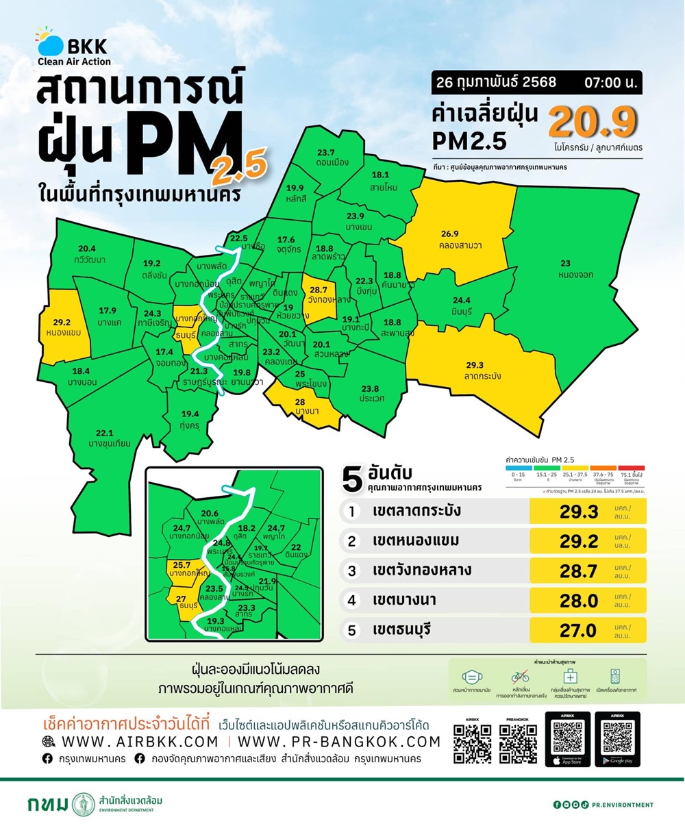 ศูนย์ข้อมูลคุณภาพอากาศกรุงเทพมหานคร ขอรายงานสถานการณ์ฝุ่นละอองขนาดไม่เกิน 2.5 ไมครอน (PM 2.5) ในกรุงเทพมหานคร ประจำวันที่ 26 กุมภาพันธ์ 2568 เวลา 07:00 น. ค่าเฉลี่ยของกรุงเทพมหานคร 20.9 ไมโครกรัมต่อลูกบาศก์เมตร (มคก./ลบ.ม.)
