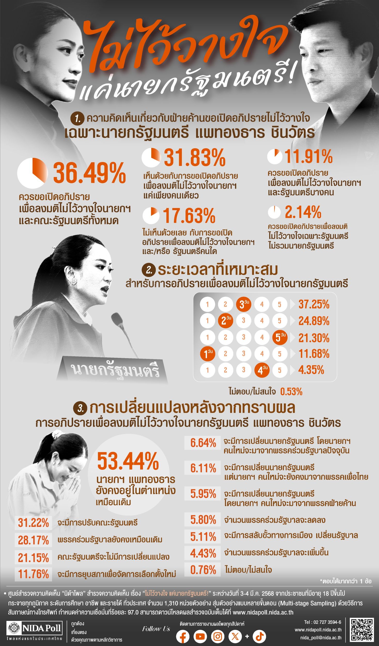 ศูนย์สำรวจความคิดเห็น “นิด้าโพล” สถาบันบัณฑิตพัฒนบริหารศาสตร์ (นิด้า) เปิดเผยผลการสำรวจ เรื่อง “ไม่ไว้วางใจ แค่นายกรัฐมนตรี !”ทำการสำรวจระหว่างวันที่ 3-4 มีนาคม 2568 จากประชาชนที่มีอายุ 18 ปีขึ้นไป กระจายทุกภูมิภาค ระดับการศึกษา อาชีพ และรายได้ ทั่วประเทศ รวมจำนวนทั้งสิ้น 1,310 หน่วยตัวอย่าง เกี่ยวกับการเปิดอภิปรายไม่ไว้วางใจเฉพาะนายกรัฐมนตรี แพทองธาร ชินวัตร การสำรวจอาศัยการสุ่มตัวอย่างโดยใช้ความน่าจะเป็นจากบัญชีรายชื่อฐานข้อมูลตัวอย่างหลัก (Master Sample) ของ “นิด้าโพล” สุ่มตัวอย่างแบบหลายขั้นตอน (Multi-stage Sampling) เก็บข้อมูลด้วยวิธีการสัมภาษณ์ทางโทรศัพท์ โดยกำหนดค่าความเชื่อมั่น ร้อยละ 97.0 จากการสำรวจเมื่อถามประชาชนถึงความคิดเห็นเกี่ยวกับฝ่ายค้านขอเปิดอภิปรายไม่ไว้วางใจเฉพาะนายกรัฐมนตรี แพทองธาร ชินวัตร พบว่า ตัวอย่าง ร้อยละ 36.49 ระบุว่า ควรขอเปิดอภิปรายเพื่อลงมติไม่ไว้วางใจนายกฯ และคณะรัฐมนตรีทั้งหมด