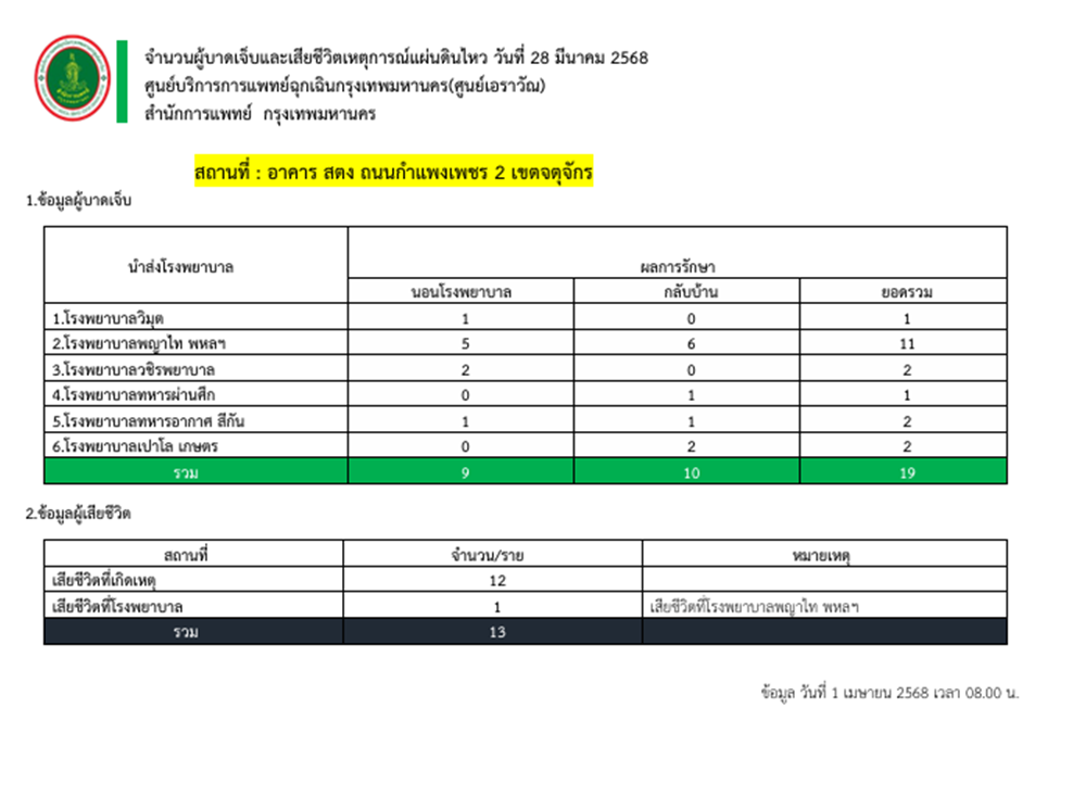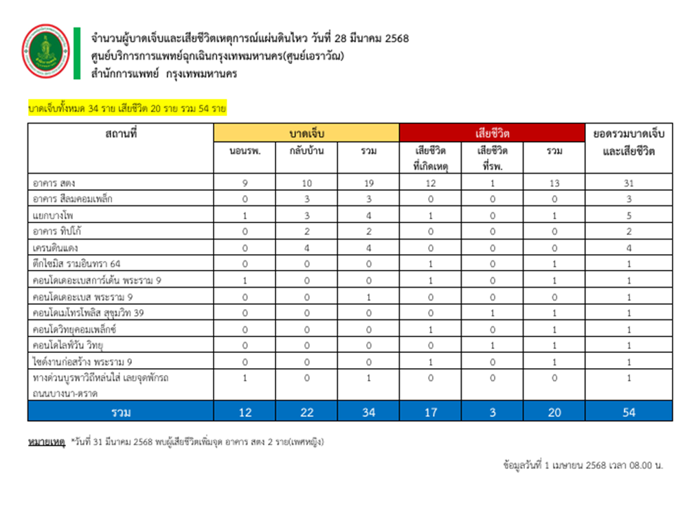 ศูนย์เอราวัณ สำนักการแพทย์ กรุงเทพมหานคร รายงานตัวเลขผู้ได้รับผลกระทบด้านชีวิตและร่างกายจากเหตุแผ่นดินไหวตามจุดต่างๆในพื้นที่กรุงเทพมหานคร ข้อมูลเมื่อเวลา 08.00 น. วันที่ 1 เม.ย. ดังนี้