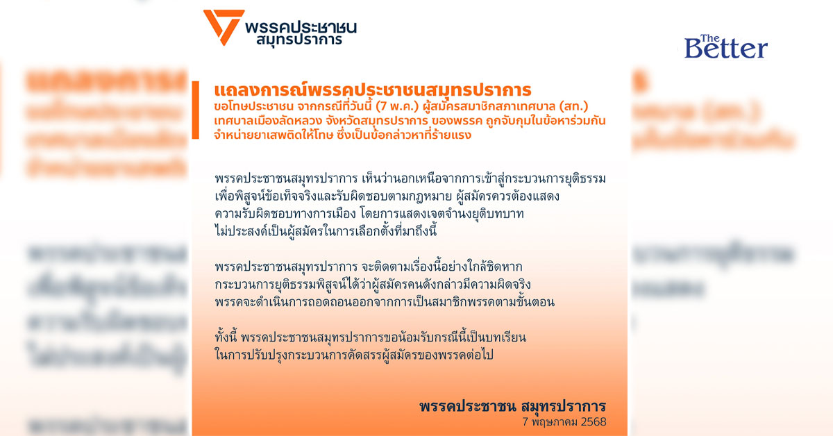 พรรคประชาชนสมุทรปราการ ขอโทษประชาชน จากกรณีที่เมื่อวันที่ 7 พ.ค. ผู้สมัครสมาชิกสภาเทศบาล (สท.) เมืองลัดหลวง จังหวัดสมุทรปราการ ของพรรค ถูกจับกุมในข้อหาร่วมกันจำหน่ายยาเสพติดให้โทษ ซึ่งเป็นข้อกล่าวหาที่ร้ายแรง