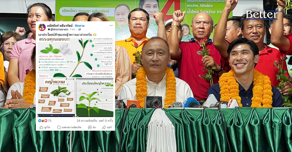"สส. ฟลุ๊ค มนัสนันท์ " ลูกชาย “นายกฯเบี้ยว” โพสต์แจงประโยชน์ "หญ้าหวาน" หลัง "นายกเบี้ยว"ประกาศชัยชนะ "เมีย-ลูกพีช" ได้รับการเลือกตั้งนายกเทศมนตรีและสมาชิกเทศบาลธัญบุรีแบบยกทีม