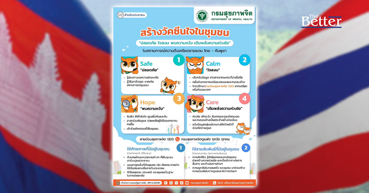 นพ.กิตติศักดิ์ อักษรวงศ์ อธิบดีกรมสุขภาพจิต กล่าวถึงการเตรียมความพร้อมของชุมชนจากสถานการณ์ความตึงเครียดบริเวณชายแดนไทย–กัมพูชา ที่ส่งผลกระทบต่อสุขภาพจิตของประชาชนในพื้นที่ชายแดน ว่า ประชาชนอาจเผชิญกับความวิตกกังวล ความเครียด และความกลัวอย่างต่อเนื่อง ซึ่งหากไม่ได้รับการดูแลอย่างเหมาะสมอาจนำไปสู่ปัญหาสุขภาพจิตในระยะยาว กรมสุขภาพจิตจึงได้นำแนวทาง “วัคซีนใจในชุมชน” เพื่อสร้างภูมิคุ้มกันทางใจแก่ประชาชน โดยเสริมสร้างความเข้มแข็งทางจิตใจในระดับชุมชน และส่งเสริมความร่วมมือจากทุกภาคส่วนในชุมชนให้เป็นกลไกสำคัญในการเฝ้าระวัง ดูแล และฟื้นฟูสุขภาพจิตอย่างยั่งยืน โดยหลักการนี้มีแนวทางหลักคือ “4 สร้าง 2 ใช้” ได้แก่ 1. การสร้างความรู้สึกปลอดภัย (Safe) ให้ประชาชนเกิดความมั่นคงทั้งทางกายและใจ 2. การสร้างความสงบ (Calm) เพื่อพัฒนาทักษะในการจัดการความเครียดและควบคุมอารมณ์ 3. การสร้างความหวัง (Hope) เพื่อส่งเสริมทัศนคติที่ดีและมองเห็นอนาคตที่สดใส แม้ในสถานการณ์วิกฤต และ 4. การสร้างความเข้าใจและดูแล (Care) เพื่อปลูกฝังความตระหนักและความรับผิดชอบในการช่วยเหลือดูแลซึ่งกันและกัน พร้อมทั้งใช้ศักยภาพและสายสัมพันธ์ในชุมชนให้เกิดประโยชน์สูงสุดในการดูแลกันอย่างต่อเนื่อง
