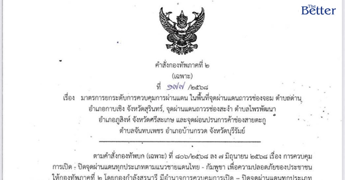 ยกเลิก คำสั่งกองทัพภาคที่ ๒ (เฉพาะ) ที่ ๑๓๖/๒๕๖๘ ลง ๒๑ มิถุนายน ๒๕๖๘ เรื่อง อนุมัติปิดจุดผ่อนปรนการค้าช่องสายตะกู ตำบลจันทบเพชร อำเภอบ้านกรวด จังหวัดบุรีรัมย์ และกำหนดมาตรการควบคุมการผ่านแดน บริเวณจุดผ่านแดนถาวรช่องจอม ตำบลด่าน อำเภอกาบเชิง จังหวัดสุรินทร์, จุดผ่านแดนถาวร