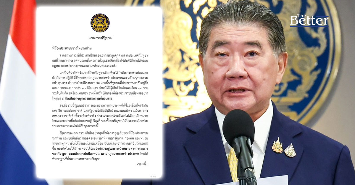 นายภูมิธรรม เวชยชัย รองนายกรัฐมนตรีและรัฐมนตรีว่าการกระทรวงมหาดไทย รักษาราชการนายกรัฐมนตรี กล่าวแถลงการณ์รัฐบาล ผ่านไปยังพี่น้องประชาชนชาวไทยทุกคน ว่า จากสถานการณ์ที่ประเทศไทยของเรากำลังถูกคุกคามจากประเทศกัมพูชา แม้ที่ผ่านมาเราจะอดทนอดกลั้นต่อการยั่วยุและเลือกที่จะใช้สันติวิธีภายใต้กรอบ กฎหมายระหว่างประเทศและตามหลักมนุษยธรรมแล้ว แต่เป็นที่น่าผิดหวังมากที่ฝ่ายกัมพูชาเลือกที่จะใช้กำลังทางทหารก่อน และยังเป็นการปฏิบัติที่ขัดต่อกรอบกฎหมายระหว่างประเทศและหลักมนุษยธรรมอย่างรุนแรง ด้วยการโจมตีโรงพยาบาล และพื้นที่ชุมชนที่ประชาชนอาศัยอยู่ซึ่งเลยแนวชายแดนมากว่า 20 กิโลเมตร ส่งผลให้มีผู้เสียชีวิตเป็นพลเรือน 13 รายรวมไปถึงเด็ก สตรีและคนชรา รวมทั้งทรัพย์สินของพี่น้องประชาชนเสียหายอย่างใหญ่หลวง ถือเป็นอาชญากรรมสงครามขั้นแรง