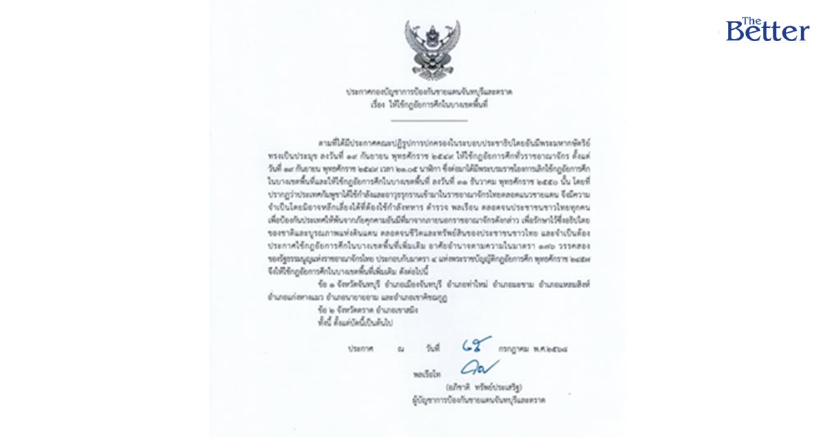 กองบัญชาการป้องกันชายแดนจันทบุรีและตราด ประกาศกฎอัยการศึก เรื่อง ให้ใช้กฎอัยการศึกในบางพื้นที่