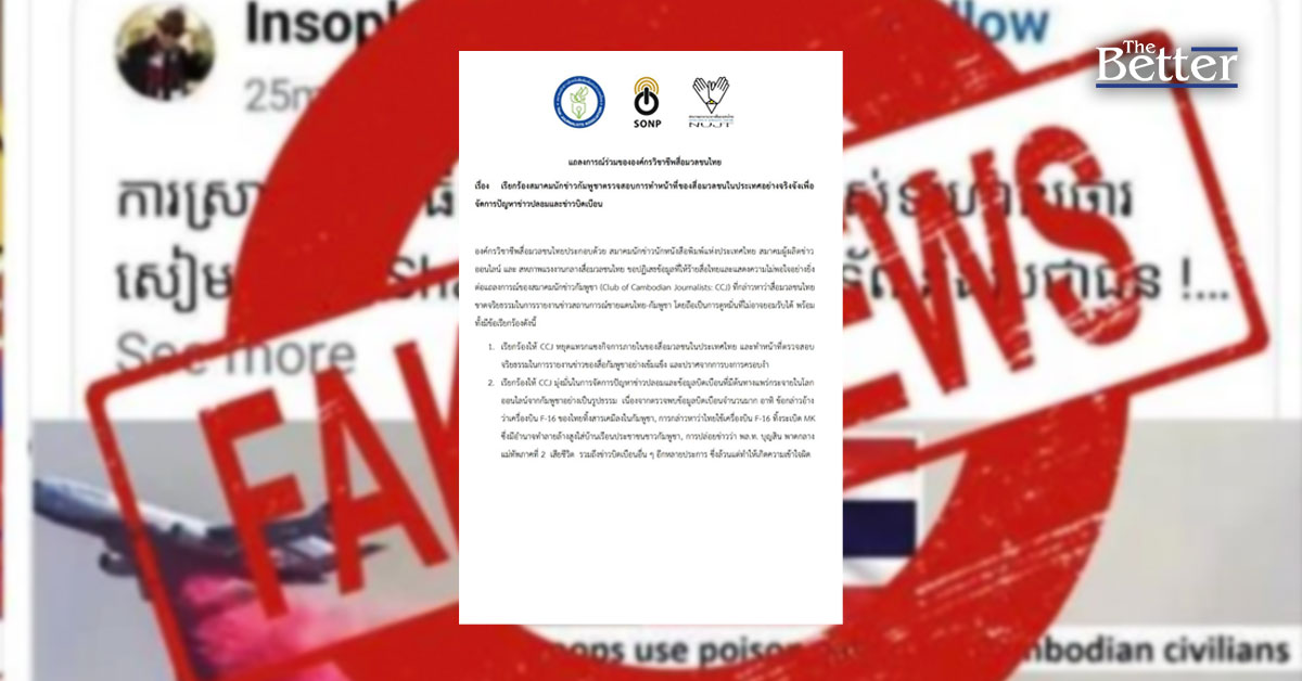 แถลงการณ์ร่วมขององค์กรวิชาชีพสื่อมวลชนไทย เรื่อง เรียกร้องสมาคมนักข่าวกัมพูชาตรวจสอบการทำหน้าที่ของสื่อมวลชนในประเทศอย่างจริงจังเพื่อจัดการปัญหาข่าวปลอมและข่าวบิดเบือน