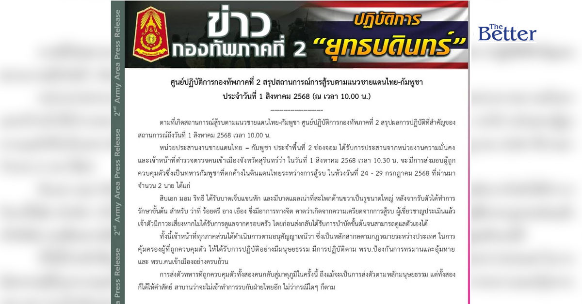 ศูนย์ปฏิบัติการกองทัพภาคที่ 2 สรุปสถานการณ์การสู้รบตามแนวชายแดนไทย-กัมพูชา ประจำวันที่ 1 สิงหาคม 2568 (ณ เวลา 10.00 น.) ตามที่เกิดสถานการณ์สู้รบตามแนวชายแดนไทย-กัมพูชา ศูนย์ปฏิบัติการกองทัพภาคที่ 2 สรุปผลการปฏิบัติที่สำคัญของสถานการณ์ถึงวันที่ 1 สิงหาคม 2568 เวลา 10.00 น. หน่วยประสานงานชายแดนไทย – กัมพูชา ประจำพื้นที่ 2 ช่องจอม ได้รับการประสานจากหน่วยงานความมั่นคง และเจ้าหน้าที่ตำรวจตรวจคนเข้าเมืองจังหวัดสุรินทร์ว่า ในวันที่ 1 สิงหาคม 2568 เวลา 10.30 น. จะมีการส่งมอบผู้ถูกควบคุมตัวซึ่งเป็นทหารกัมพูชาที่ตกค้างในดินแดนไทยระหว่างการสู้รบ ในห้วงวันที่ 24 - 29 กรกฎาคม 2568 ที่ผ่านมา จำนวน 2 นาย ได้แก่