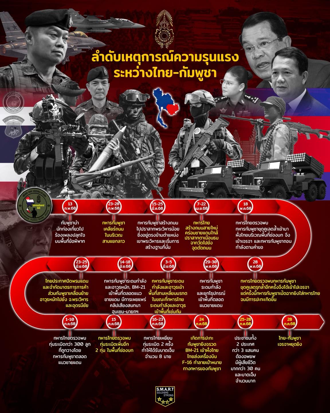 - 24 ก.ค. – กัมพูชาเปิดฉากยิงจรวด BM-21 ใส่พลเรือนไทย ไทยตอบโต้ด้วย F-16