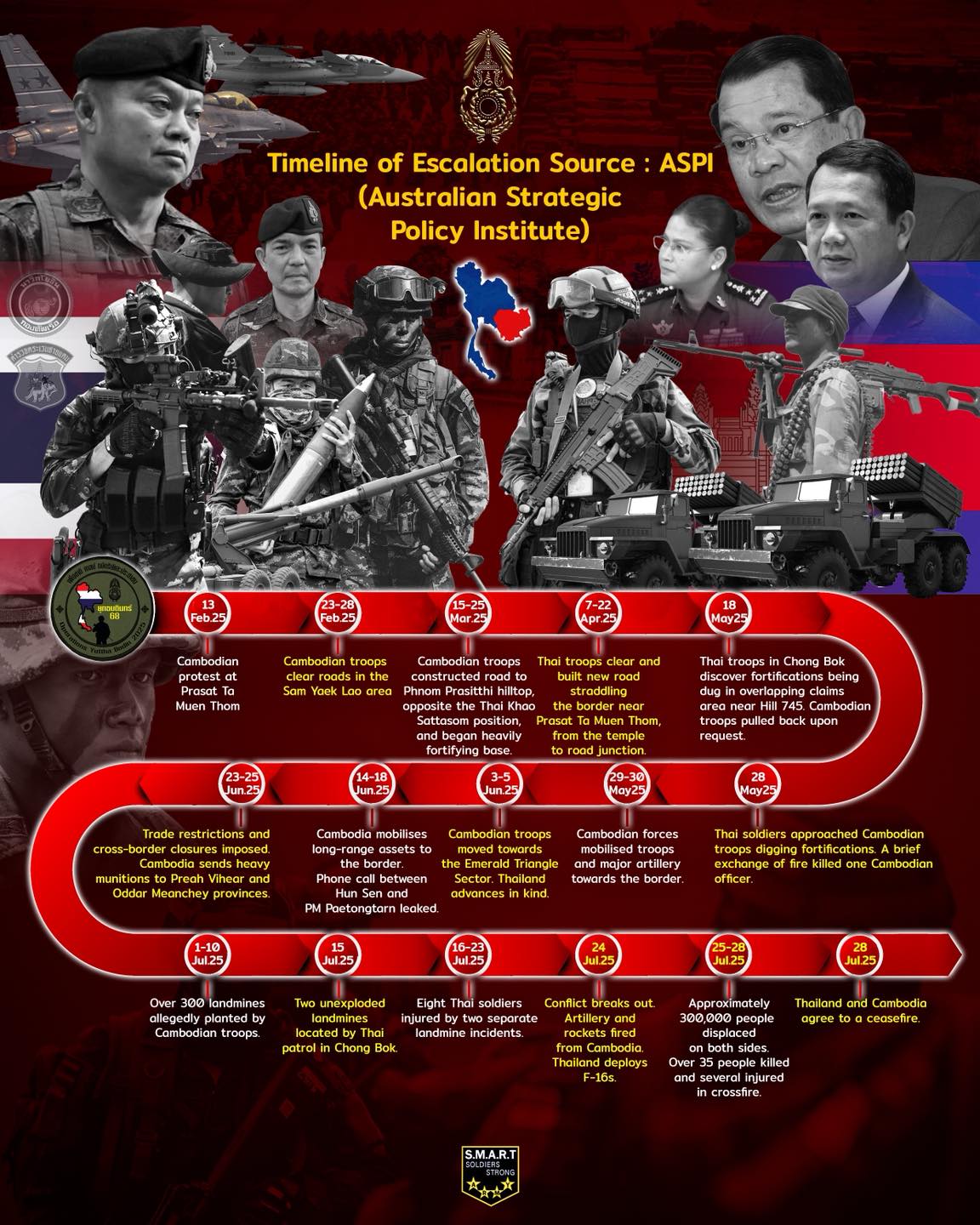 ความจริงที่ยืนยันได้ ประเทศไทยไม่ได้เริ่มต้นการรุกราน แต่ปกป้องสิทธิตามหลักอธิปไตยจากการกระทำที่ชัดเจนของกัมพูชา ทั้งการขุดแนวมั่นคงซ้อนทับ วางกับระเบิดสังหาร และโจมตีพลเรือนด้วยอาวุธหนัก